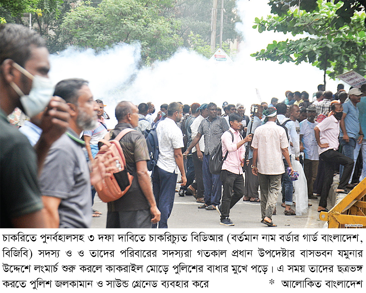 বিক্ষোভরত চাকরিচ্যুত বিডিআর সদস্যদের সরাতে জলকামান ও একাধিক সাউন্ড গ্রেনেড নিক্ষেপ করেছে পুলিশ। এসময় ঘটনাস্থল থেকে বেশ কয়েকজনকে আটক করা হয়। গতকাল সোমবার প্রধান উপদেষ্টার সরকারি বাসভবন ‘যমুনা’র সামনে বিক্ষোভকারীদের সঙ্গে আইনশৃঙ্খলা বাহিনীর এই মুখোমুখি অবস্থান দুপুর ১২টা ৩০ মিনিটের দিকে সংঘটিত হয়। এর আগে সকাল থেকে তিন দফা দাবি আদায়ের লক্ষ্যে রাজধানীর শাহবাগে জাতীয় জাদুঘরের সামনে অবস্থান নেয় সাবেক বিডিআর (বর্তমানে বিজিবি) সদস্যদের একটি অংশ, যারা চাকরিচ্যুত হয়েছেন। দাবি আদায়ের অংশ হিসেবে বেলা ১১টার কিছু পর পুলিশি বাধা উপেক্ষা করে তারা যমুনা অভিমুখে পদযাত্রা শুরু করেন। মৎস্য ভবন মোড় পর্যন্ত পৌঁছালে পুলিশ তাদের বাধা দেয়। কিন্তু সেখান থেকেও তারা পিছু না হটে কাকরাইল মোড়ে বসে পড়ে অবস্থান কর্মসূচি শুরু করেন। পুলিশ বিক্ষোভকারীদের জানিয়ে দেয়, দশ মিনিটের মধ্যে তারা যদি যমুনা এলাকা না ছাড়ে, তবে ‘আইনানুগ ব্যবস্থা’ নেওয়া হবে।