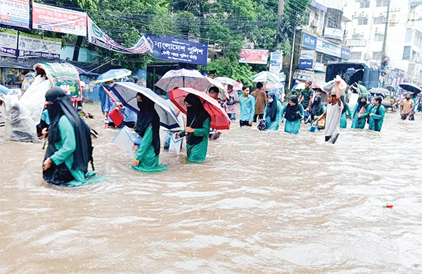 টানা বৃষ্টিতে ফেনী শহরে দেখা দিয়েছে জলাবদ্ধতা। পানি বৃদ্ধি পাওয়ায় মুহুরী নদীতে ভেসে গেছে কয়েকটি দোকান ঘর। নদীপাড়ের রাস্তা ভেঙে ফুলগাজী বাজার-রাজসপুর সড়ক যোগাযোগ বন্ধ রয়েছে। এমতাবস্থায় ফেনী শহরের কিছু কিছু শিক্ষা প্রতিষ্ঠান বন্ধ ঘোষণা করা হয়েছে। শহরের অলিগলিতে কোথাও কোথাও তিন থেকে চার ফুট পানি জমেছে। গ্রামগঞ্জের রাস্তাঘাট পানিতে তলিয়ে অনেক এলাকায় যোগাযোগ ব্যবস্থা বন্ধ রয়েছে। ছবিটি গতকাল তোলা * ফোকাস বাংলা