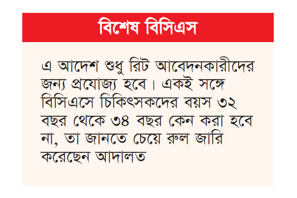 ৪৮তম বিশেষ বিসিএসে চিকিৎসকদের মধ্যে থেকে ৩২ বছরের বেশি বয়সীদের পরীক্ষায় বসার সুযোগ দিতে স্বাস্থ্য মন্ত্রণালয়, স্বাস্থ্য অধিদপ্তর ও পিএসসিকে নির্দেশ দিয়েছেন হাইকোর্ট। এ আদেশ শুধু রিট আবেদনকারীদের জন্য প্রযোজ্য হবে। একই সঙ্গে বিসিএসে চিকিৎসকদের বয়স ৩২ বছর থেকে ৩৪ বছর কেন করা হবে না, তা জানতে চেয়ে রুল জারি করেছেন আদালত। এ সংক্রান্ত রিটের প্রাথমিক শুনানি নিয়ে গতকাল বুধবার হাইকোর্টের বিচারপতি মো. আকরাম হোসেন চৌধুরী ও বিচারপতি ফয়েজ আহমেদের সমন্বয়ে গঠিত একটি বেঞ্চ এ আদেশ দেন। আদালতে এদিন রিটের পক্ষে শুনানি করেন ব্যারিস্টার এএম মাহবুব উদ্দিন খোকন। তার সঙ্গে ছিলেন ব্যারিস্টার সাকিব মাহবুব। চিকিৎসক ঐক্য পরিষদের সভাপতি ডা. মাহফুজুল হক চৌধুরী বিষয়টি নিশ্চিত করেছেন। তিনি জানিয়েছেন, রিটকারীদের পরীক্ষায় বসানোর জন্য বলেছেন আদালত। একই সঙ্গে রুলও জারি করেছেন।