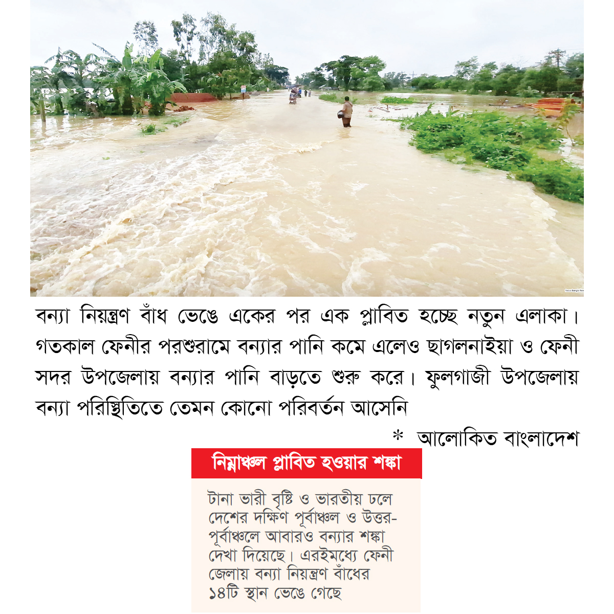 টানা ভারী বৃষ্টি ও ভারতীয় ঢলে দেশের দক্ষিণ পূর্বাঞ্চল ও উত্তর-পূর্বাঞ্চলে আবারও বন্যার শঙ্কা দেখা দিয়েছে। এরইমধ্যে ফেনী জেলায় বন্যা নিয়ন্ত্রণ বাঁধের ১৪টি স্থান ভেঙে গেছে। এর ফলে ৩০টি গ্রাম প্লাবিত হয়েছে। ঘরবাড়ি তলিয়ে যাওয়ায় মানুষ অন্যত্র আশ্রয় নিচ্ছে। এছাড়া ভারী বৃষ্টিতে দেশের বিভিন্ন জেলায় রাস্তা-ঘাট তলিয়ে গেছে। অনেক স্থানে যোগাযোগ ব্যবস্থা ভেঙে পড়েছে। প্রবল বর্ষণে ভেসে গেছে হাজার হাজার পুকুর ও মাছের ঘের। তলিয়ে গেছে ফসলি জমি। সব মিলিয়ে জনদুর্ভোগ চরম পর্যায়ে পৌঁছেছে। বন্যা নিয়ন্ত্রণ বাঁধ ভাঙনের কারণে একের পর এক প্লাবিত হচ্ছে নতুন নতুন এলাকা। গতকাল বৃহস্পতিবার সকাল পর্যন্ত পরশুরামে বন্যার পানি কমে এলেও ছাগলনাইয়া, ফেনী সদর উপজেলায় বন্যার পানি বাড়তে শুরু করে। ফুলগাজী উপজেলায় বন্যা পরিস্থিতিতে তেমন কোনো পরিবর্তন হয়নি। এদিকে পরশুরামের পরিস্থিতির কিছুটা উন্নতি হওয়ার সঙ্গে সঙ্গে বিভিন্ন এলাকায় ক্ষয়ক্ষতি দৃশ্যমান হতে শুরু করেছে।