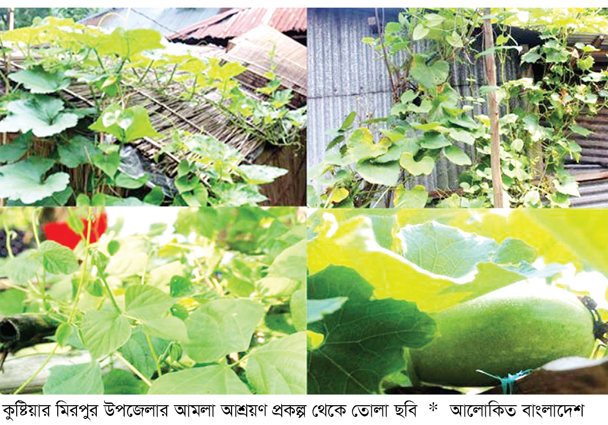 কুষ্টিয়ার মিরপুর উপজেলার আমলা আশ্রয়ণ প্রকল্পের বাসিন্দাদের বাড়ির আঙিনা এবং ঘরের চালা, রান্না ঘরের চালা তারা সবজিতে ভরে তুলেছেন। আশ্রয়ণ প্রকল্পের বাড়িগুলো এখন একেকটি পুষ্টির বাগানে রূপ নিয়েছে। মৌসুমী নানা সবজির চাষ করছেন তারা বাড়ির আশপাশে। রাস্তার দুই ধারের পতিত জমিতে মাঁচা করে গ্রীষ্মকালীন বরবটি, শিম, করলা ও চালকুমড়ার চাষ করেছেন। স্বল্প পরিষরে বসতবাড়ির আঙিনায় এসব সবজি চাষ করে যেমন পুষ্টির চাহিদা পূরণ হচ্ছে তেমন পরিবেশও সুন্দর হচ্ছে। পুরুষের চেয়ে নারীরা এগিয়ে এ চাষের ক্ষেত্রে। আর বাড়ির আশপাশের এসব জমি এবং ঘরের চালায় সবজি চাষ সম্পর্কে তাদের পরামর্শ দিয়েছে কৃষি অফিস। সেইসঙ্গে বিনামূল্যে আশ্রয়ণ প্রকল্পের প্রতিটি ঘরে ঘরে এসব সবজি বীজ দিয়ে সহায়তা করেছে কৃষি অফিস। সেই বীজ রোপণ করে পরিচর্যা করেছে আশ্রয়ণ প্রকল্পের এসব মানুষ। বাড়ির আশপাশে এসব সবজি চাষ করে বেশ খুশি তারা। আমলা আশ্রয়ণ প্রকল্পের বাসিন্দা রাশিদা খাতুন জানান, বাড়ির আশপাশে এবং ঘরের চালায় যে সবজি করা যায় তা বিষমুক্ত ও স্বাস্থ্যসম্মত। বাজারে যেসব সবজি পাওয়া যায় তার চেয়ে অনেক ভালো। বাজারে বেশিরভাগই সার ও বিষ দেওয়া সবজি। তিনি বলেন, আমি ঘরের এক পাশে চালকুমড়ার বীজ রোপণ করেছিলাম। চালকুমড়ার লতা এখন ঘরের চাল ছেয়ে গেছে। বেশ কয়েকটি চালকুমড়াও পেয়েছি। হাশেম আলী জানান, করোনার মধ্যে কৃষি অফিসের লোকজন এসে আমাদের এখানে বিনামূল্যে বিভিন্ন সবজির বীজ দিয়ে গিয়েছিল। আমি লাউ, চালকুমড়া, পুঁইশাকের বীজ নিয়েছিলাম। বাড়ির আঙিনায় সেগুলো চাষ করেছি। সকেরা খাতুন জানান, আমি চালকুমড়া, বরবটি ও করলার বীজ পেয়েছিলাম। সেগুলো রোপণের পরে লতাগুলোকে আমি বাঁশের মাঁচা করে তুলে দিয়েছি। এরইমধ্যে আমি ১০-১৫টা কুমড়া পেয়েছি। পাচ্ছি বরবটি। করলা এখনও ধরেনি। তবে ফুল এসেছে। উপসহকারী কৃষি কর্মকর্তা সাদ্দাম হোসেন জানান, আমি নিয়মিত আশ্রায়ণ প্রকল্পের এসব সবজি পরিদর্শন করি। বসতবাড়িতে এসব সবজিতে তেমন একটা খরচ ও পরিচর্যার দরকার হয় না।
