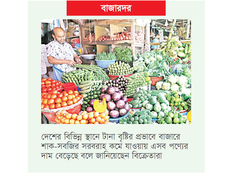 ১১ নম্বর কাঁচাবাজারের সবজি বিক্রেতা রইস উদ্দিন বলেন, যে কাঁচামরিচ আগের দিন কিনেছিলাম ১০০ টাকা কেজি, সেটা এখন কেনা লাগছে ২৮০ থেকে ২৯০ টাকা। ঢাকার বাইরে থেকে পণ্য আসছে না। আবার টানা বৃষ্টি হওয়ায় পাইকারি ব্যবসায়ীরা মজুত করে দাম বাড়িয়ে দিতে পারেন, এ জন্য দাম একটু চড়া। তবে বৃষ্টি শেষ হলে দাম আবার আগের মতো হয়ে যাবে। মুসলিম হোসেন নামের আরেক বিক্রেতা বলেন, পাইকারি বাজারে কাঁচামরিচের সরবরাহ খুব কম। পাইকারি বাজার থেকে ২৫০ টাকার ওপরে কাঁচামরিচ কিনতে হয়েছে। খুচরা বিক্রেতাদেরও বেশি দাম দিয়েই কিনতে হচ্ছে। এদিকে প্রতিকেজি টমেটো ১০ টাকা বেড়ে বিক্রি হচ্ছে ৯০-১২০ টাকা, একইভাবে বেগুন ৯০-১০০ টাকা। করলা ৮০ টাকা, পটোল, ঝিঙে, ধুন্দল ৬০-৭০ টাকা, শসা ৬০-৮০ টাকা, কচুরমুখি ৮০-১০০ টাকা, কাঁকরোল ৮০-১০০ টাকা, সজনেডাটা ১২০-১৪০ টাকা, ঢেঁড়স ৪০-৫০ টাকা, কাঁচা পেঁপে ৩০-৪০ টাকা, কাঁচকলা ৩০-৪০ টাকা হালি, বরবটি ৬০ টাকা কেজিতে বিক্রি হচ্ছে। সবজি বিক্রেতা সোবহান আহমেদ বলেন, কয়েকদিন ধরে বৃষ্টি হচ্ছে। অনেক জায়গায় বন্যা হয়েছে। ফলে সবজি আর আগের মতো পাওয়া যাচ্ছে না। সরবরাহ কমে যাওয়ায় দামও বেড়ে গেছে। তবে বাজারে স্থিতিশীল রয়েছে আলু, মসলা,মাছ ও মাংসের দাম। দেশি পেঁয়াজ প্রতি কেজি মানভেদে ৫৫-৬০ টাকা, দেশি আদা ১৩০-১৫০ টাকা, দেশি রসুন ১২০-১৫০ টাকা, আমদানি করা রসুন ১৯০-২০০ টাকা, দেশি মসুর ডাল (চিকন দানা) ১৪০ টাকা, আমদানি করা মসুর ডাল ( মোটাদানা) ১১৫-১২০ টাকায় বিক্রি হচ্ছে। প্রতি ডজন ডিম ১২৮-১৩০ টাকা, প্রতিকেজি গরুর মাংস ৭৫০-৮০০, খাসির মাংস ১১০০-১২০০ টাকায় বিক্রি হচ্ছে। মুসলিম বাজারে সোনালি মুরগির দরদাম কর?তে দেখা যায় শেফালী আক্তারকে। তিনি বলেন, সুপের জন্য মুরগি কিনবো, দোকানদার ২৯০ টাকা কেজি বলছে। আমি ২৮০ টাকা দিয়ে গত সপ্তাহে কিনেছি। এখন দরদাম করছি। সোনালি মুরগির দাম কিছুটা বাড়লেও ব্রয়লার মুরগি আগের মতো ১৭০-১৮০ টাকা কেজিতে বিক্রি হচ্ছে। বাজারে ট্যাংরা, চিংড়ি ৮০০-১২০০ টাকা, ১ কেজি ওজনের ইলিশ বিক্রি হচ্ছে ২২০০-২৪০০ টাকায়। আকারভেদে রুই ও কাতলের কেজি ৩০০-৪৫০ টাকা, পাবদা ৪০০-৫০০, তেলাপিয়া ও পাঙাশ ২২০-২৫০ টাকায় বিক্রি হচ্ছে।