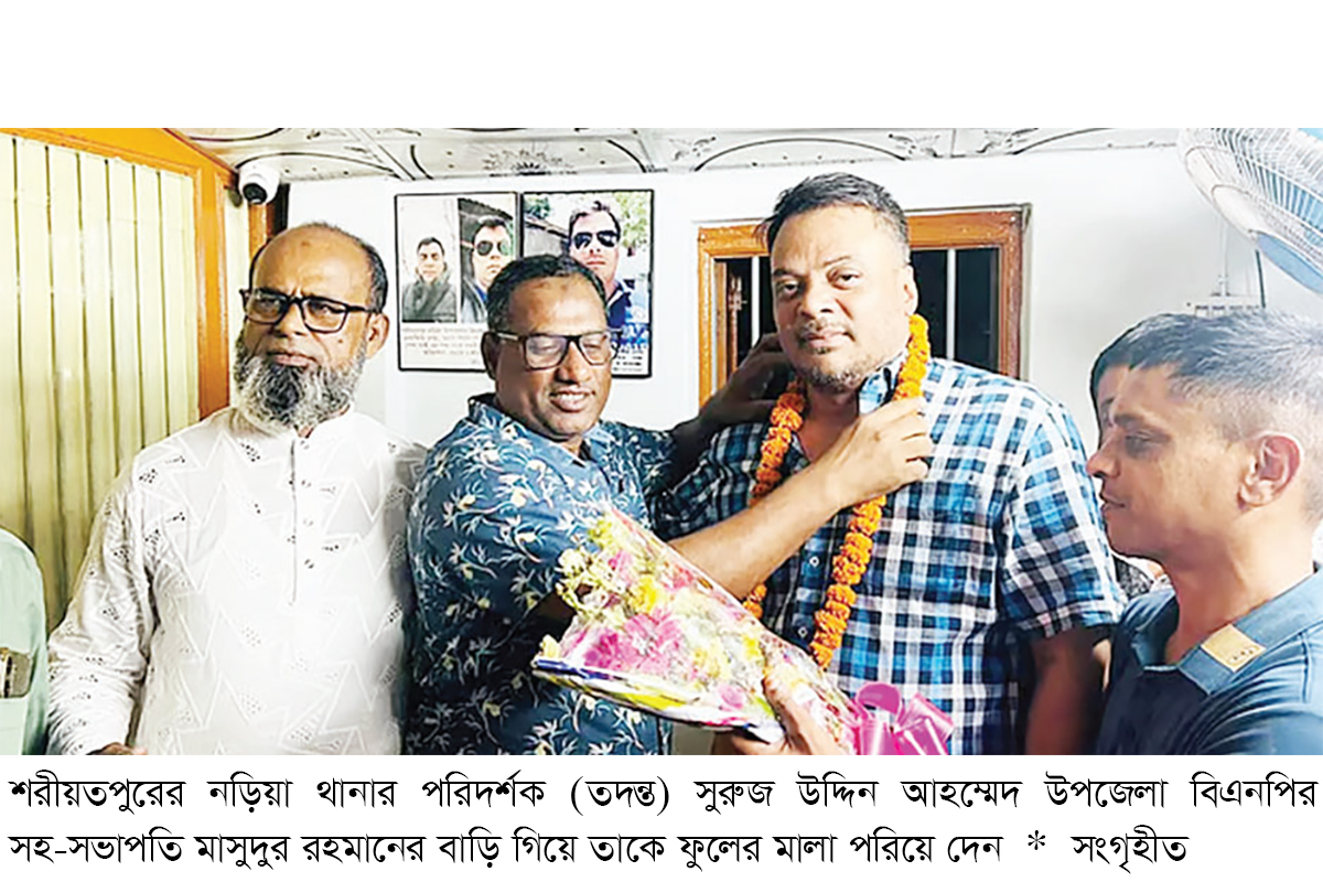 পরিদর্শক সুরুজ উদ্দিন আহম্মেদ গত রোববার নড়িয়া উপজেলা বিএনপির সহ-সভাপতি মাসুদুর রহমানের বাড়িতে যান। তাকে ফুলের মালা পরিয়ে দেওয়ার ছবি গত সোমবার ফেসবুকে ছড়িয়ে পড়ে। এ সম্পর্কে সুরুজ উদ্দিন আহম্মেদ বলেন, ‘একটি মামলাসংক্রান্ত কাজে ওই বিএনপি নেতার বাড়ি গিয়েছিলাম। সেখানে তার গলার মালাটা আমি ঠিক করে দিচ্ছিলাম। সেই অবস্থায় কেউ হয়তো ছবি তুলেছেন।’ সুরুজ উদ্দিন আহম্মেদ এর আগে ২০২৩ সালের ১৫ জুন শরীয়তপুরের পদ্মা সেতু দক্ষিণ থানায় কর্মরত থাকা অবস্থায় সাময়িক বরখাস্ত হয়েছিলেন। তখন তার বিরুদ্ধে শরীয়তপুরের নাওডোবা বাজারের ব্যবসায়ী আবু জাফর ওরফে ঠান্ডু চোকদারকে তুলে নিয়ে পিটিয়ে ৭২ লাখ টাকার চেক নেওয়ার এবং একটি ছিনতাই মামলার চার আসামিকে পিটিয়ে আহত করার অভিযোগ উঠেছিল। গত বছর আওয়ামী লীগ সরকার পতনের পর তার বরখাস্তের আদেশ প্রত্যাহার হয়। সুরুজ উদ্দিন আহম্মেদকে ২০২৫ সালের ২৫ মার্চ নড়িয়া থানায় বদলি করা হয়। সম্প্রতি তাকে আওয়ামী লীগের এক নেতা ও ইউপি চেয়ারম্যানের সঙ্গে একটি রেস্তোরাঁয় জন্মদিনের অনুষ্ঠান উদ্?যাপন করতে দেখা গেছে। নড়িয়া থানা ও স্থানীয় সূত্র জানায়, নড়িয়া পৌরসভার ২ নম্বর ওয়ার্ডের শুভগ্রাম এলাকার বাসিন্দা মাসুদুর রহমান ওরফে রিপন পেদা জার্মানপ্রবাসী। ৭ জুলাই মাসুদুর রহমান দেশে ফিরেছেন। এরপর তার বাড়ি গিয়ে তাকে শুভেচ্ছা জানাচ্ছেন বিভিন্ন পর্যায়ের দলের নেতাকর্মী ও সমর্থকরা। পরিদর্শক (তদন্ত) সুরুজ উদ্দিন আহম্মেদ গত রোববার রাতে উপজেলা বিএনপির সহ-সভাপতি মাসুদুর রহমানের বাসায় যান। তখন তার বসার ঘরে কর্মকর্তা সুরুজ উদ্দিন বিএনপি নেতা মাসুদুর রহমানের গলায় ফুলের মালা পরিয়ে দেন। গলায় ফুলের মালা পরিয়ে দেওয়ার ছবি গতকাল ফেসবুকে ছড়িয়ে পড়ে। সেখানে অনেকে নানা ধরনের মন্তব্য করেন। ফারুক আলম নামের একজন ওই ছবি পোস্ট করে লেখেন, ‘মাসুদুর রহমানের একটা গুণ সে থানায় যায় না, থানার ওসি তদন্ত স্যার তার কাছে আসেন শুভেচ্ছা বিনিময় করতে। মনজুড়ানো একটা মুহূর্ত। শুভকামনা মামা আপনার জন্য।’ এ সম্পর্কে মাসুদুর রহমান বলেন, ‘আমার এক আত্মীয়ের বিরুদ্ধে একটি হত্যা মামলা ছিল। পুলিশ সেটার চূড়ান্ত প্রতিবেদন দিয়েছে। তারপরও সিআইডি থেকে তাকে ফোন করা হয়েছিল। ওই বিষয়টি আমি তার (পরিদর্শক সুরুজ উদ্দিন আহম্মেদ) কাছে জানতে চেয়েছিলাম। তাই তিনি আমার বাসায় এসেছিলেন। ওই সময় অনেকেই আমাকে ফুলের মালা দিয়ে শুভেচ্ছা জানিয়েছেন। তখন হয়তো তিনি সেখানে দাঁড়ানো ছিলেন। কেউ হয়তো সেই ছবি ফেসবুকে দিয়েছেন।’ নড়িয়া থানার ভারপ্রাপ্ত কর্মকর্তা (ওসি) আসলাম উদ্দিন মোল্যা বলেন, ‘কোনো কর্মকর্তা এভাবে ব্যক্তিগত সম্পর্ক স্থাপন করে জনসমক