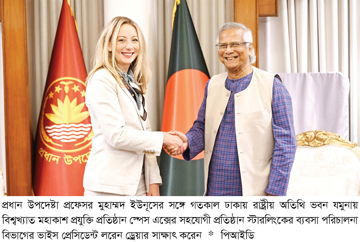 বাংলাদেশে স্টারলিংক সফলভাবে চালু করার ক্ষেত্রে সরকারি কর্মকর্তাদের সমন্বিত প্রচেষ্টার প্রশংসা করেছেন স্পেসএক্সের ভাইস প্রেসিডেন্ট লরেন ড্রেয়ার। গতকাল শুক্রবার রাষ্ট্রীয় অতিথি ভবন যমুনায় প্রধান উপদেষ্টা অধ্যাপক ড. মুহাম্মদ ইউনুসের সঙ্গে এক বৈঠকে তিনি এই মন্তব্য করেন। লরেন ড্রেয়ার বলেন, ‘আমরা ১৫০টি দেশ ও অঞ্চলে কাজ করি। আমরা এত দক্ষতা ও দ্রুত সিদ্ধান্ত গ্রহণ আগে কখনও দেখিনি। স্পেসএক্স-এর সব সহকর্মীর পক্ষ থেকে আপনাকে ধন্যবাদ জানাই। আমরা আপনার লোকজনের সঙ্গে ঘনিষ্ঠভাবে কাজ করার অপেক্ষায় আছি।’