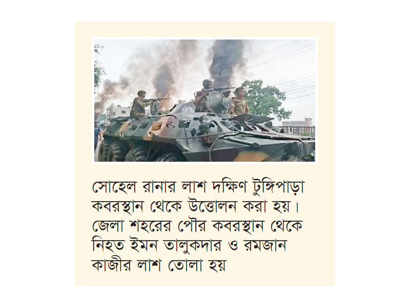 এরই ধারাবাহিকতায় বেলা ১২টা ৪৫ মিনিটের দিকে জেলা শহরের পৌর কবরস্থানে নির্বাহী ম্যাজিস্ট্রেট রাসেল মুন্সি ও রন্টি পোদ্দারের উপস্থিতিতে নিহত রমজান কাজী ও ইমন তালুকদারের লাশ উত্তোলন করা হয়। অন্যদিকে, টুঙ্গিপাড়ার সহকারী কমিশনার (ভূমি) মো. মারুফ দস্তেগীরের উপস্থিতিতে নিহত সোহেল রানার লাশ উদ্ধার করা হয়। নিহতদের লাশ উদ্ধার শেষে সুরতহাল প্রতিবেদন করে ময়নাতদন্তের জন্য গোপালগঞ্জ ২৫০ শয্যা বিশিষ্ট জেনারেল হাসপাতালে পাঠানো হয়েছে।
