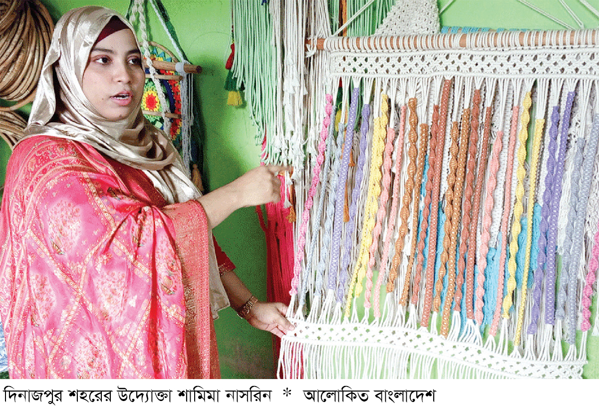 দিনাজপুরে হস্তশিল্প তৈরি করে সফল উদ্যোক্তা হয়েছেন শামিমা নাসরিন। ঘরে বসেই তৈরি করছেন ড্রিমক্যাচার ও ম্যাক্রামে পণ্য। এতে লাখ টাকা আয়ের পাশাপাশি কর্মসংস্থান সৃষ্টি হয়েছে ৩০ নারীর। তার পণ্য যাচ্ছে বিদেশেও। অনলাইনে প্রতিদিন ১০ থেকে ১৫ হাজার টাকার অর্ডার পাচ্ছেন। পণ্যের ডিজাইন ও মানের কারণে প্রশংসিত হচ্ছেন তিনি। দিনাজপুর শহরের পশ্চিম রামনগর লালবাগ এলাকার একটি ভাড়া বাড়ি থেকে কাজ শুরু করেন শামিমা নাসরিন। মাত্র ৩ হাজার টাকার পুঁজি নিয়ে ২০২০ সালের করোনার লকডাউনের সময় হাতে সুতার কাজ দিয়ে যাত্রা শুরু করেছিলেন। শামিমা নাসরিন বলেন, ‘ছোটবেলা কেটেছে লক্ষ্মীপুরে। মায়ের কাছ থেকেই হস্তশিল্প শিখেছি। দিনাজপুরে আসার পর স্বামীর অনুপ্রেরণায় নতুনভাবে যাত্রা শুরু করি। শুরুটা ছিল নিজের ঘর সাজানোর শখ থেকে। এখন সেই শখই হয়ে উঠেছে পেশা।’ ঘর সাজানোর কাজে ব্যবহৃত তার তৈরি পণ্যের মধ্যে রয়েছে- ড্রিমক্যাচার, ম্যাক্রামে ওয়ালম্যাট, জায়নামাজ হ্যাঙ্গার, প্ল্যান্ট হ্যাঙ্গার, ম্যাক্রামে শেলফ, টেবিল রানার, কুশিকাটার কাজ, বুনন টেবিল, বেতের ঝুড়ি, কোরআন হ্যাঙ্গার, ম্যাক্রামে আয়না ও লাক্সারি ক্যানভাস ড্রিমক্যাচার। এসব পণ্য তৈরি হয় সুতা, দড়ি, পালক, বেত ও মালয়েশিয়ান বোর্ড ব্যবহার করে। শামিমার ফেসবুক পেজ ‘চতুর্ভুজ’-এর মাধ্যমেই প্রতিদিন ১০ থেকে ১৫ হাজার টাকার অর্ডার পাচ্ছেন। এসব পণ্য হোম ডেলিভারির মাধ্যমে সরবরাহ করা হয়। ক্যাশ অন ডেলিভারিরভিত্তিতে লেনদেন সম্পন্ন হয়। পণ্যের দাম শুরু হয়েছে মাত্র ২০০ টাকা থেকে, আর বড় ডিজাইনের পণ্যের দাম ৫ হাজার টাকা পর্যন্ত। তার প্রতিষ্ঠান এখন দক্ষ নারী কর্মী তৈরির একটি প্ল্যাটফর্ম হয়ে উঠেছে। চার বছর ধরে এখানে কাজ করছেন কামরুন্নাহার কাকলি। তিনি বলেন, এখানে কাজ শিখে এখন মাসে ৮ থেকে ১০ হাজার টাকা আয় করছি। এতে আমার সন্তানদের লেখাপড়ার খরচ চালাতে পারছি।’ কলেজছাত্রী মনীষা আক্তার বলেন, ‘আমি আদর্শ মহাবিদ্যালয়ের ছাত্রী। এখানে কাজ শিখে ওয়ালম্যাট তৈরির বিভিন্ন ডিজাইনের দক্ষতা অর্জন করেছি। ভবিষ্যতে নিজেই উদ্যোক্তা হতে চাই।’ প্রতিষ্ঠানের প্রোডাকশন ম্যানেজার আয়েশা সিদ্দিকা জানান, ‘চার বছর ধরে এখানে কাজ করছি। এখন মাসে ১৫ থেকে ১৬ হাজার টাকা বেতন পাচ্ছি। লেখাপড়া চালিয়ে যাওয়ার পাশাপাশি নিজেকে একজন সফল উদ্যোক্তা হিসেবে গড়তে চাই।