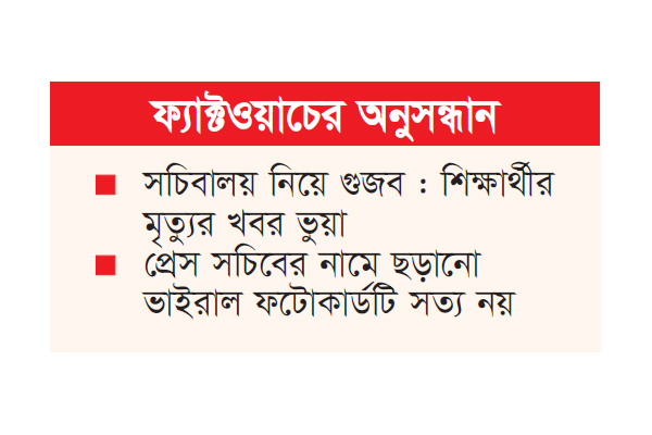 সচিবালয়ে আন্দোলনের সময় এক শিক্ষার্থীর মৃত্যু হয়েছে বলে সামাজিক যোগাযোগমাধ্যমে ছড়ানো খবরটি গুজব বলে জানিয়েছে রিউমার স্ক্যানার। ভুয়া তথ্য ও অপপ্রচার শনাক্তে কাজ করা ফ্যাক্টচেক সংস্থা রিউমার স্ক্যানারের অনুসন্ধানে দেখা গেছে, সচিবালয়ের সামনে আন্দোলনরত শিক্ষার্থীদের সঙ্গে আইনশৃঙ্খলা বাহিনীর পাল্টাপাল্টি ধাওয়ার সময় হাসিরুন মাহিন সূর্য নামে এক শিক্ষার্থী আহত হন।