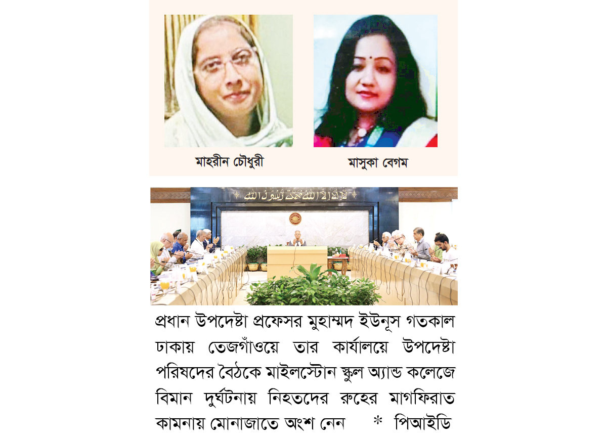 উত্তরার মাইলস্টোন স্কুল অ্যান্ড কলেজে ভয়াবহ বিমান দুর্ঘটনায় নিহত দুই শিক্ষককে রাষ্ট্রীয় সম্মাননা দেওয়ার সিদ্ধান্ত নিয়েছে উপদেষ্টা পরিষদ। গতকাল বৃহস্পতিবার সকালে রাজধানীর তেজগাঁওয়ে প্রধান উপদেষ্টার কার্যালয়ে উপদেষ্টা পরিষদের বৈঠক এ সিদ্ধান্ত নেওয়া হয়। সভায় প্রধান উপদেষ্টা ড. মুহাম্মদ ইউনূস সভাপতিত্ব করেন।