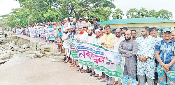 সাগরের অব্যাহত ভাঙনে লন্ডভন্ড কুয়াকাটা সৈকত রক্ষায় স্থায়ী প্রতিরক্ষা প্রকল্প দ্রুত বাস্তবায়নের দাবিতে গতকাল শনিবার কুয়াকাটা সৈকতে পৌর বিএনপি, বাংলাদেশ জামায়াতে ইসলামী পৌরশাখাসহ বিভিন্ন সংগঠনের ব্যানারে মানববন্ধন অনুষ্ঠিত হয় * আলোকিত বাংলাদেশ