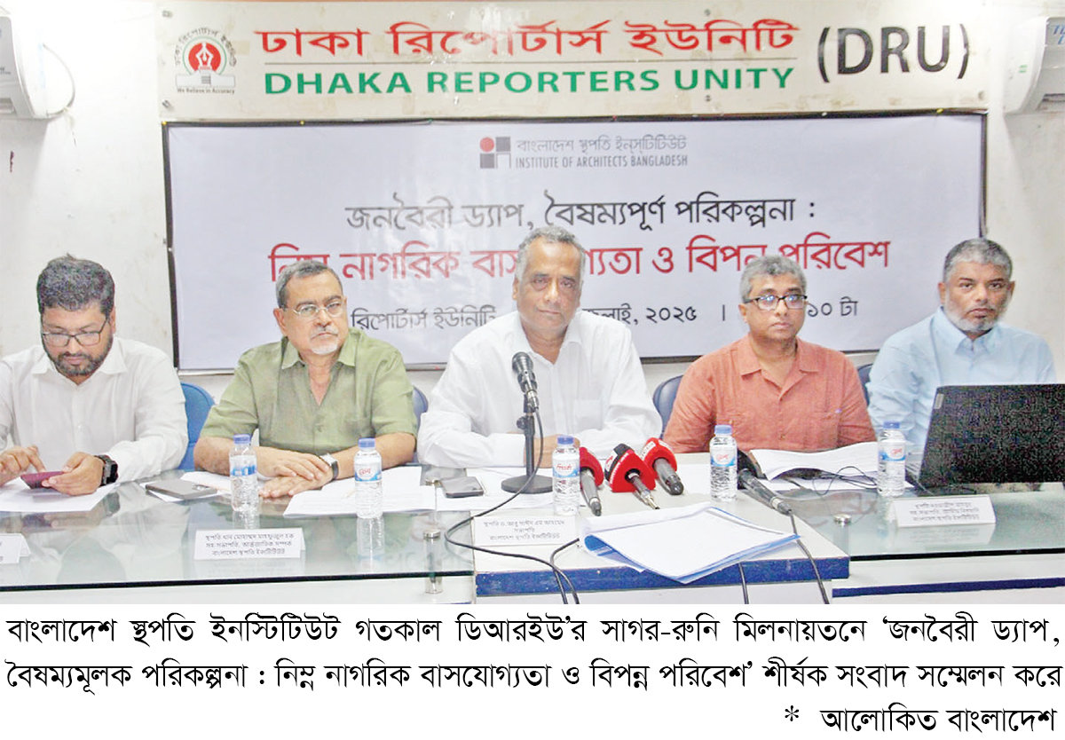 গণশুনানি উপেক্ষা করে কিছু গোষ্ঠীর স্বার্থে তড়িঘড়ি করে ডিটেইলড এরিয়া প্ল্যান (ড্যাপ) রচনা করা হয়েছে। ফলে ভবন নির্মাণের অনুমোদনের ক্ষেত্রে দুর্নীতি ও জনভোগান্তি বেড়েছে। ভবন নির্মাণ শিল্পে স্থবিরতা তৈরি হওয়ায় ‘বৈষম্যমূলক’ ড্যাপ সংশোধনের দাবি তুলেছে বাংলাদেশ স্থপতি ইনস্টিটিউট। গতকাল রোববার রাজধানীর সেগুনবাগিচায় ঢাকা রিপোর্টার্স ইউনিটির (ডিআরইউ) সাগর-রুনি মিলনায়তনে বাংলাদেশ স্থপতি ইনস্টিটিউট আয়োজিত সংবাদ সম্মেলনে এসব দাবি করা হয়। ‘জনবৈরী ড্যাপ, বৈষম্যপূর্ণ পরিকল্পনা : নিম্ন নাগরিক বাসযোগ্যতা ও বিপন্ন পরিবেশ’ শীর্ষক সংবাদ সম্মেলনে ড্যাপের ১২টি আইনগত ও তথ্যগত ত্রুটি তুলে ধরা হয়। সংবাদ সম্মেলনে লিখিত বক্তব্য উত্থাপন করেন বাংলাদেশ স্থপতি ইনস্টিটিউটের সাধারণ সম্পাদক স্থপতি ড. মাসুদ উর রশিদ। সম্মেলনে উপস্থিত ছিলেন সংগঠনের সভাপতি স্থপতি ড. আবু সাঈদ এম আহমেদ, সহ-সভাপতি (আন্তর্জাতিক সম্পর্ক) স্থপতি খান মোহাম্মদ মাহফুজুল হক, সহ-সভাপতি (জাতীয় বিষয়াদি) স্থপতি নওয়াজীশ মাহবুব, সম্পাদক (পেশা) স্থপতি ওয়াহিদ আসিফ, সম্পাদক (ঐতিহ্য ও সংস্কৃতি) স্থপতি কাজী শামীমা শারমিন প্রমুখ।
