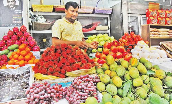 রাজধানীর পুরান পল্টনের ফল বাজারে দেশি-বিদেশি ফলে সয়লাব। দাম কিছুটা বেশি হলেও, চাহিদা অনুযায়ী ফল কিনতে ভিড় করে নগরবাসী। মৌসুমি ফলের পাশাপাশি আমদানি করা আপেল, আঙুর, নাশপাতি, কমলার চাহিদাও রয়েছে বেশ। ছবিটি গতকাল রোববার তোলা হয় * ফোকাস বাংলা