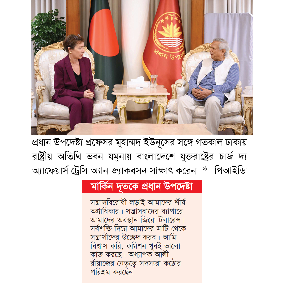 প্রধান উপদেষ্টা বলেন, ‘সন্ত্রাসবিরোধী লড়াই আমাদের শীর্ষ অগ্রাধিকার। সন্ত্রাসবাদের ব্যাপারে আমাদের অবস্থান জিরো টলারেন্স। সর্বশক্তি দিয়ে আমাদের মাটি থেকে সন্ত্রাসীদের উচ্ছেদ করব।’ গতকাল সোমবার বিকালে রাষ্ট্রীয় অতিথি ভবন যমুনায় ঢাকায় নিযুক্ত যুক্তরাষ্ট্রের চার্জ দ্য অ্যাফেয়ার্স ট্রেসি অ্যান জ্যাকবসন প্রধান উপদেষ্টার সঙ্গে সাক্ষাৎ করতে গেলে তিনি এ কথাগুলো বলেন। ৪০ মিনিট ব্যাপী ওই বৈঠকে তারা পারস্পরিক স্বার্থসংশ্লিষ্ট বিষয়াদি নিয়ে আলোচনা করেন, যার মধ্যে বাংলাদেশ ও যুক্তরাষ্ট্রের চলমান শুল্ক আলোচনা অন্তর্ভুক্ত ছিল। চার্জ দ্য অ্যাফেয়ার্স জ্যাকবসন বাংলাদেশের সংস্কারপ্রচেষ্টা ও গণতান্ত্রিক রূপান্তরের প্রতি তার সরকারের সমর্থন পুনর্ব্যক্ত করেন, যা আগামী বছরের শুরুতে জাতীয় নির্বাচনের মাধ্যমে চূড়ান্ত রূপ পাবে বলে আশা করা হচ্ছে। প্রধান উপদেষ্টা জাতীয় ঐকমত্য গঠনের লক্ষ্যে কাজ করে যাওয়া কমিশনের অগ্রগতির কথাও তুলে ধরেন, যা রাজনৈতিক দলগুলোর মধ্যে মূল সংস্কারগুলোর বিষয়ে ঐক্য গঠনে সচেষ্ট।