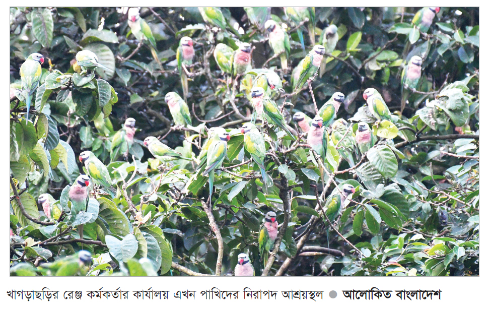 খাগড়াছড়ির রেঞ্জ কর্মকর্তার কার্যালয়ে আশ্রয় গড়ে তুলেছে শত শত টিয়া। শিকারীদের উৎপাত না থাকায় ও বনবিভাগের তৎপরতায় নিরাপদ আবাসস্থল পাওয়ায় অন্তত ১০ বছরের বেশি সময় ধরে কার্যালয়ের একাধিক বৃক্ষে আবাস গড়ে তুলেছে এসব মদনা টিয়া। প্রকৃতি সুরক্ষায় অসামান্য অবদান রাখা এসব টিয়া সংরক্ষণে নতুন করে ফলজ চারা রোপণ করেছে বনবিভাগ।