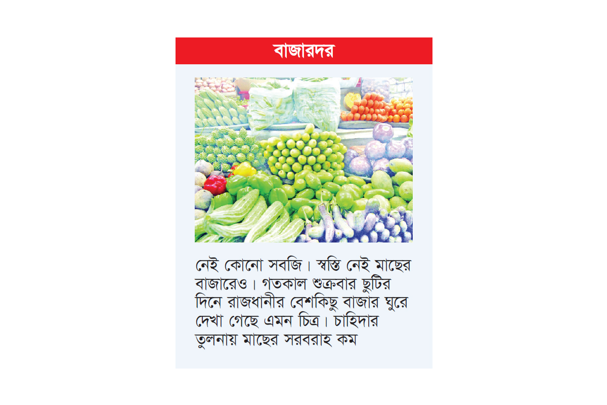 মাঝ বর্ষায় কাঁচাবাজারে কমেছে সবজির যোগান। যার প্রভাব পড়েছে দামে। ৬০ থেকে ৮০ টাকা কেজির নিচে নেই কোনো সবজি। স্বস্তি নেই মাছের বাজারেও। গতকাল শুক্রবার ছুটির দিনে রাজধানীর বেশকিছু বাজার ঘুরে দেখা গেছে এমন চিত্র। চাহিদার তুলনায় মাছের সরবরাহ কম। আবার দামও বেশি। গত সপ্তাহের তুলনায় সব ধরনের মাছের দাম কেজিতে বেড়েছে ২০ থেকে ৫০ টাকা পর্যন্ত। ৬০০ টাকা কেজির নিচে মিলছে না নদ-নদীর মাছ। ৩০০-এর কমে মিলছে কেবল চাষের নলা-তেলাপিয়া। আর এক কেজি ইলিশ কিনতে পকেট থেকে বেরিয়ে যাবে দুই থেকে আড়াই হাজার টাকা।