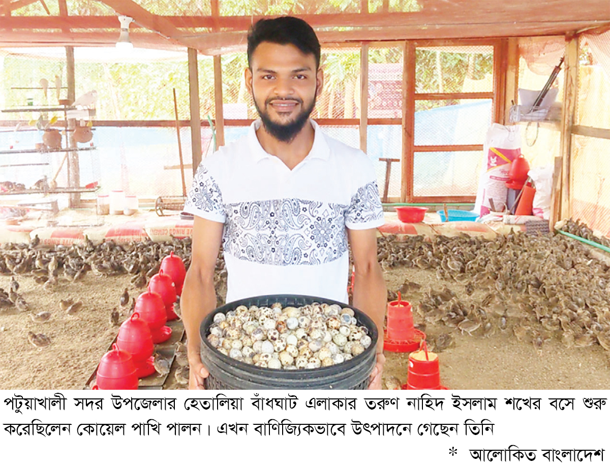 পটুয়াখালী সদর উপজেলার হেতালিয়া বাঁধঘাট এলাকার তরুণ নাহিদ ইসলাম শখের বসে শুরু করেছিলেন কোয়েল পাখি পালন। আজ সেই শখই পরিণত হয়েছে সফল পেশায়। প্রায় ৫ হাজার কোয়েল পাখি রয়েছে এখন তার খামারে, প্রতিদিন উৎপাদন হচ্ছে চার হাজারেরও বেশি ডিম। তার এই খামার এখন শুধু আয়ের উৎস নয়, বরং এলাকার তরুণদের জন্য একটি প্রেরণাও। ফাজিল শেষ বর্ষের শিক্ষার্থী নাহিদ ইসলাম, পেশায় একসময় ছাত্র, এখন একজন সফল খামারি। বাবা মাইনুল ইসলাম স্বপনের সহযোগিতায় শুরু করেন খামার। প্রথমদিকে ৮ জোড়া কোয়েল দিয়ে শুরু হয় তার যাত্রা। হঠাৎ এক সময় সব পাখি মারা যায়। হতাশ না হয়ে তিনি আবার শুরু করেন নতুন উদ্যমে। পরিবারের শুরুতে অনাগ্রহ থাকলেও এখন সবাই তাঁর পাশে।