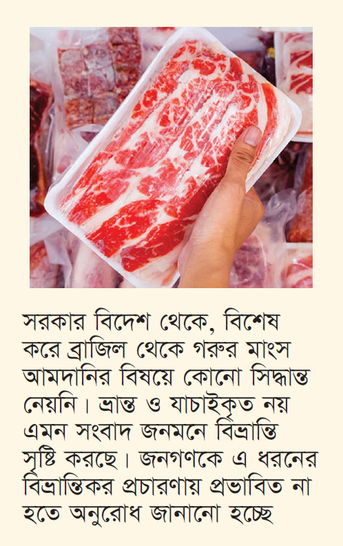 মৎস্য ও প্রাণিসম্পদ মন্ত্রণালয় জানিয়েছে, সম্প্রতি বিভিন্ন গণমাধ্যম ও সামাজিক যোগাযোগ মাধ্যমে এমন খবর প্রচারিত হচ্ছে যে, ব্রাজিল বাংলাদেশকে কেজি প্রতি ১২০ টাকায় গরুর মাংস সরবরাহ করবে। এ বিষয়ে স্পষ্টভাবে জানানো যাচ্ছে যে, সরকার বিদেশ থেকে, বিশেষ করে ব্রাজিল থেকে গরুর মাংস আমদানির বিষয়ে কোনো সিদ্ধান্ত নেয়নি। ভ্রান্ত ও যাচাইকৃত নয় এমন সংবাদ জনমনে বিভ্রান্তি সৃষ্টি করছে। জনগণকে এ ধরনের বিভ্রান্তিকর প্রচারণায় প্রভাবিত না হতে অনুরোধ জানানো হচ্ছে।