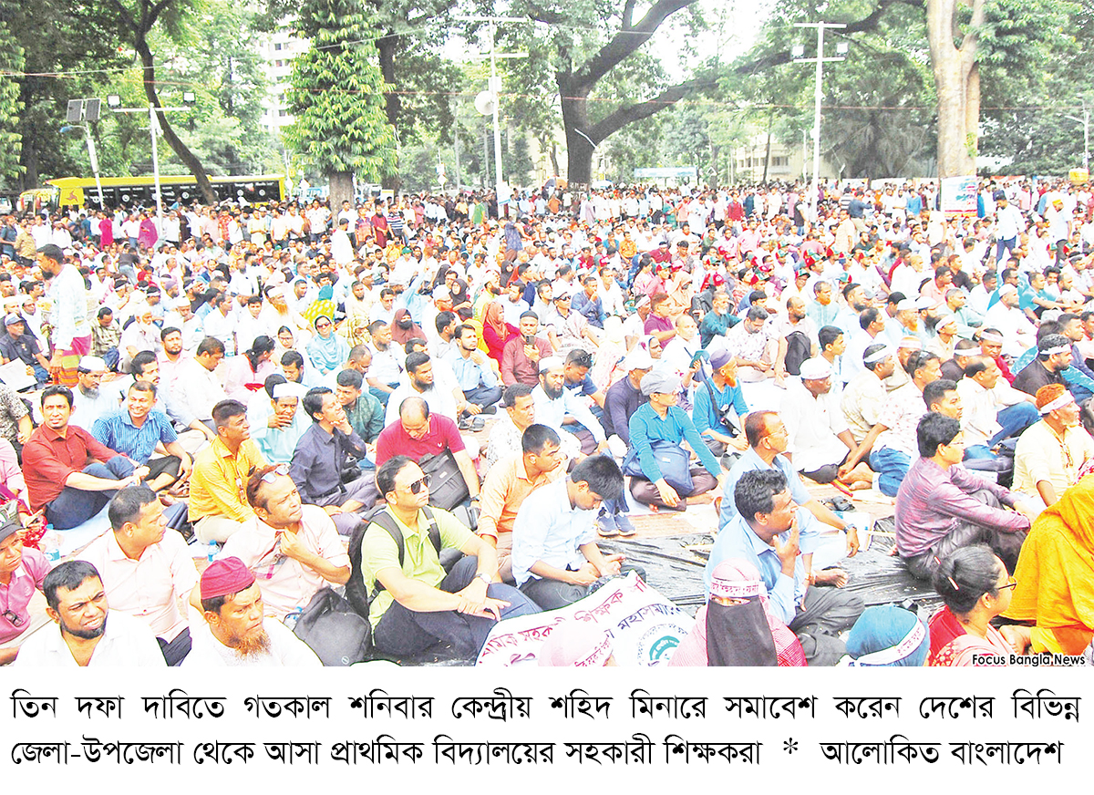 তবে, সহকারী শিক্ষকদের বেতন গ্রেড ১৩তমই (শুরুর মূল বেতন ১১ হাজার টাকা, এর সঙ্গে অন্যান্য সুযোগ-সুবিধা যোগ হয়) রয়ে গেছে। পরামর্শক কমিটি ‘সহকারী শিক্ষক’ পদ বিলুপ্ত করে শুরুর পদ ‘শিক্ষক’ করার সুপারিশ করে ‘শিক্ষক’ হিসেবে শুরুতে বেতন গ্রেড ১২তম করতে বলেছে। এরপর দুই বছর পর চাকরি স্থায়ীকরণ ও আরও দুই বছর পর তারা ‘সিনিয়র শিক্ষক’ হবেন। তখন তাদের বেতন গ্রেড হবে ১১তম। তবে পরামর্শক কমিটির সুপারিশ সংশোধন করে সহকারী শিক্ষকদের শুরুর পদের বেতন গ্রেড ন্যূনতম ১১ তম গ্রেড করাসহ তিন দফা দাবিতে আন্দোলনে নামেন সহকারী শিক্ষকেরা। তাদের অপর দুটি দাবি হলো প্রধান শিক্ষকের শূন্য পদ শতভাগ পদোন্নতির মাধ্যমে পূরণ করা এবং ১০ বছর ও ১৬ বছরের উচ্চতর গ্রেড পাওয়ার জটিলতা নিরসন করা। এই তিন দফা দাবিতে পূর্ব ঘোষণা অনুযায়ী গতকাল সকাল থেকে শহীদ মিনারে মহাসমাবেশ শুরু করেন শিক্ষকেরা। বিভিন্ন জেলা-উপজেলা থেকে শিক্ষকেরা বাস ভাড়া করে মহাসমাবেশে আসেন। শিক্ষক নেতা মুনির হোসেনের সভাপতিত্বে অনুষ্ঠিত মহাসমাবেশে বক্তব্য দেন, শিক্ষক নেতা মোহাম্মদ শামছুদ্দীন মাসুদ, শাহিনুর আল আমিন প্রমুখ। মহাসমাবেশে বিভিন্ন রাজনৈতিক দলের নেতারাও অংশ নিয়ে সংহতি জানান। বিএনপির সাংগঠনিক সম্পাদক শিক্ষক নেতা সেলিম ভূঁইয়া বর্তমান সরকার এই দাবি পূরণ না করলে সংখ্যাগরিষ্ঠতা নিয়ে বিএনপি ক্ষমতায় গেলে এই দাবি পূরণের আশ্বাস দেন। মহাসমাবেশে অংশ নিয়ে সুপ্রিম কোর্টের আইনজীবী মোহাম্মদ ছিদ্দিক উল্লাহ মিয়া বলেন, শিক্ষকের দাবি পূরণ না করা হলে তিনি শিক্ষকের পক্ষে আইনি লড়াই করে দাবি আদায়ের চেষ্টা করবেন। শিক্ষক মহাসমাবেশে অংশ নিয়ে প্রাথমিক শিক্ষার গুরুত্বারোপ করে গণসংহতি আন্দোলনের প্রধান সমন্বয়কারী জোনায়েদ সাকী বলেন, যে দেশে প্রাথমিক শিক্ষাকে গুরুত্ব দেওয়া হয় না, সেই দেশে শিক্ষার মেরুদণ্ড ভঙ্গুর হয়ে যায়। আরও সংহতি জানান আদর্শ শিক্ষক ফেডারেশনের সেক্রেটারি জেনারেল এ বি এম ফজলুল করিম, বাংলাদেশ খেলাফত মজলিশের মহাসচিব মাওলানা জালালুদ্দীন আহমদ, বাংলাদেশ সচিবালয় কর্মকর্তা-কর্মচারী সংযুক্ত পরিষদের সভাপতি মো. বাদিউল কবীর প্রমুখ।