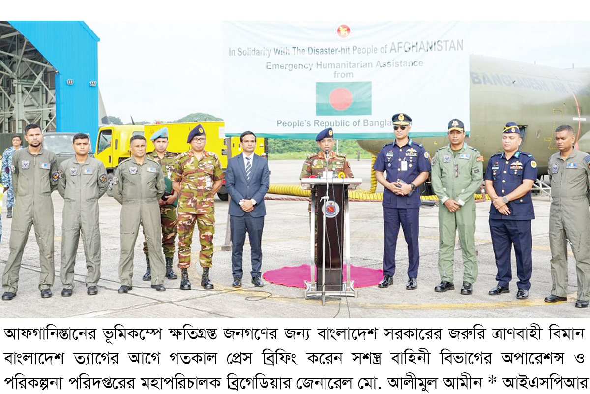 আন্তঃবাহিনী জনসংযোগ পরিদপ্তর (আইএসপিআর) গতকাল শুক্রবার এক সংবাদ বিজ্ঞপ্তিতে জানিয়েছে, প্রধান উপদেষ্টার নির্দেশে ভূমিকম্পে সৃষ্ট আকস্মিক দুর্যোগ মোকাবেলায় আফগান জনগণের জন্য বাংলাদেশ সরকারের পক্ষ থেকে জরুরি মানবিক সহায়তা প্রদানের উদ্যোগ নেওয়া হয়েছে। এরই ধারাবাহিকতায় সকাল ৮টায় বাংলাদেশ বিমান বাহিনীর একটি পরিবহন বিমান জরুরি ত্রাণ সামগ্রী নিয়ে কাবুলের উদ্দেশ্যে রওনা হয়েছে। গতকাল শুক্রবারের ১১.২২৭ টন ত্রাণ সহায়তার মধ্যে রয়েছে তাঁবু, কম্বল, শীতবস্ত্র, খাবার পানি, শুকনো খাবার, কাপড়, বিস্কুট, মিল্ক পাউডার, নুডলস ও ঔষধ। এসব ত্রাণ সামগ্রী হস্তান্তর শেষে বিমান বাহিনীর পরিবহন বিমানটি আজই দেশে ফেরার কথা রয়েছে। সশস্ত্র বাহিনী বিভাগের অপারেশন ও পরিকল্পনা পরিদপ্তরের মহাপরিচালক ব্রিগেডিয়ার জেনারেল মো. আলীমুল আমীন বিমানটি বাংলাদেশ ত্যাগের পূর্বে এ উপলক্ষ্যে প্রেস ব্রিফিং করেন। এ সময় সশস্ত্র বাহিনী বিভাগ ও বিমান বাহিনীর ঊর্ধ্বতন কর্মকর্তা, পররাষ্ট্র মন্ত্রণালয়ের প্রতিনিধি এবং গণমাধ্যমের প্রতিনিধিরা উপস্থিত ছিলেন। আইএসপিআর জানিয়েছে, বাংলাদেশ সশস্ত্র বাহিনী বিশ্বাস করে, সরকারের পাঠানো এই মানবিক সহায়তা আফগানিস্তানের ভূমিকম্পে ক্ষতিগ্রস্ত জনগণের দুর্ভোগ কমাতে সহায়ক হবে। আগামী দিনগুলোতে সরকারের নির্দেশনা অনুযায়ী বৈশ্বিক যেকোনো প্রয়োজনে বাংলাদেশ সশস্ত্র বাহিনী আত্মনিয়োগের জন্য অঙ্গীকারবদ্ধ।