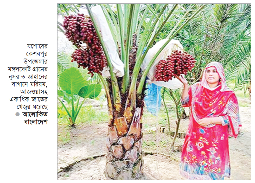 যশোরের কেশবপুর উপজেলার মঙ্গলকোট গ্রামের নুসরাত জাহান লিজা বাড়ির আঙিনায় সৌদি খেজুরের বাগান গড়ে তুলেছেন। তার বাগানে এখন থোকায় থোকায় ঝুলছে মরিয়ম, আজওয়াসহ একাধিক জাতের লাল টসটসে খেজুর। দীর্ঘ ছয় বছরের পরিশ্রমে বীজ থেকে চারা উৎপাদন করে রোপণ করা গাছে এবার এসেছে প্রথম ফলন।