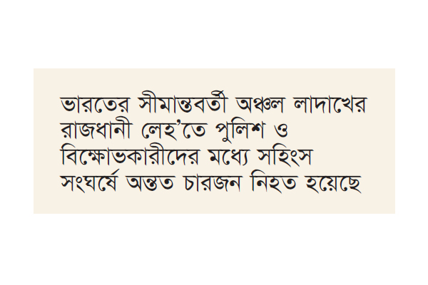 ভারতের সীমান্তবর্তী অঞ্চল লাদাখের রাজধানী লেহ’তে পুলিশ ও বিক্ষোভকারীদের মধ্যে সহিংস সংঘর্ষে অন্তত চারজন নিহত হয়েছে। এরপর ভারতীয় নিরাপত্তা বাহিনী সেখানে কারফিউ জারি করেছে। অঞ্চলটিকে আলাদা রাজ্যের মর্যাদা দেওয়া এবং ষষ্ঠ তফসিলে অন্তর্ভুক্তির দাবিতে গত বুধবার সেখানে ব্যাপক বিক্ষোভ হয়। ভারতের সংবাদমাধ্যম ইন্ডিয়া টুডে ও ব্রিটিশ সংবাদমাধ্যম বিবিসি এ খবর জানিয়েছে।