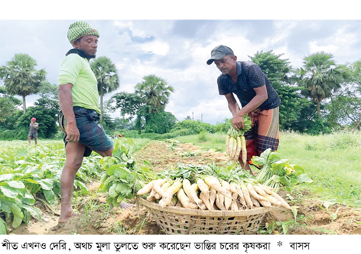 জেলার গোমতী নদীর বুড়িচং উপজেলার ভান্তির চরের সকালটা অন্যান্য দিনের মতোই ব্যস্ত। তবে এখন চোখে পড়ছে সাদা মুলার স্তূপ- কেউ জমি থেকে তুলছে, কেউ গোছাচ্ছে, কেউ আঁটি বেঁধে বাজারে পাঠানোর জন্য প্রস্তুতি নিচ্ছে। চরের প্রতিটি ধাপ যেন শীতের আগাম আনন্দকে বয়ে আনছে। ভান্তি গ্রামে ঘুরে দেখলে বোঝা যায়, নারী-পুরুষ সবাই এই মৌসুমের মূল চাষ মুলার সঙ্গে জড়িয়ে আছে। কৃষক আব্দুল ওহাব, ফারুক হোসেন, তারা দীর্ঘদিন ধরে চরের মাটিকে সাদা সবজির সঙ্গে পরিচিত করেছেন, তারা বলেন, ‘বর্ষার শেষে শরৎকাল শুরুতেই বীজ বুনেছি। শীত এখনও দেরি আছে তবুও মুলা তুলতে শুরু করেছি। পাইকাররা খেত থেকে কিনে নিচ্ছে। প্রতি কেজি ৩৫ থেকে ৪০ টাকায় বিক্রি হচ্ছে। মৌসুমে এর চেয়ে বেশি দাম পাওয়া যায় না। তবে এতে কৃষকরা খুশি। চরের পথ ধরে হাঁটতে হাঁটতে মনির হোসেনের খেত দেখা যায়। মাঠে দাঁড়িয়ে তিনি বললেন, ‘বেশির ভাগ কৃষকই পুরো জমির ফলন পাইকারদের কাছে বিক্রি করছেন। আমি নিজে ২৪ শতাংশ জমির মুলা ৫৮ হাজার টাকায় বিক্রি করেছি। সব খরচ বাদ দিয়ে প্রায় ২০ হাজার টাকার মতো লাভ হয়েছে। আমাদের চরের মুলা কুমিল্লার নিমসার বাজার হয়ে ঢাকাসহ দেশের নানা প্রান্তে যাচ্ছে।’ চরের চারপাশের মাঠজুড়ে সবুজ পাতার মধ্যে সাদা মুলা এক অসাধারণ দৃশ্য। তবে সব জমি সমান ভাগ্যবান নয়। যেসব জায়গায় পানি নিষ্কাশনের ব্যবস্থা ভালো ছিল না, সেসব জমিতে সাম্প্রতিক বৃষ্টির পানি জমে ফলন ক্ষতিগ্রস্ত হয়েছে। কৃষি কর্মকর্তারা দ্রুত মুলা তুলতে বলছেন, না হলে নিচের অংশ পচে যাবে। দ্রুত তোলার পর আবারও নতুন বীজ বুনে চাষ চালানো সম্ভব।