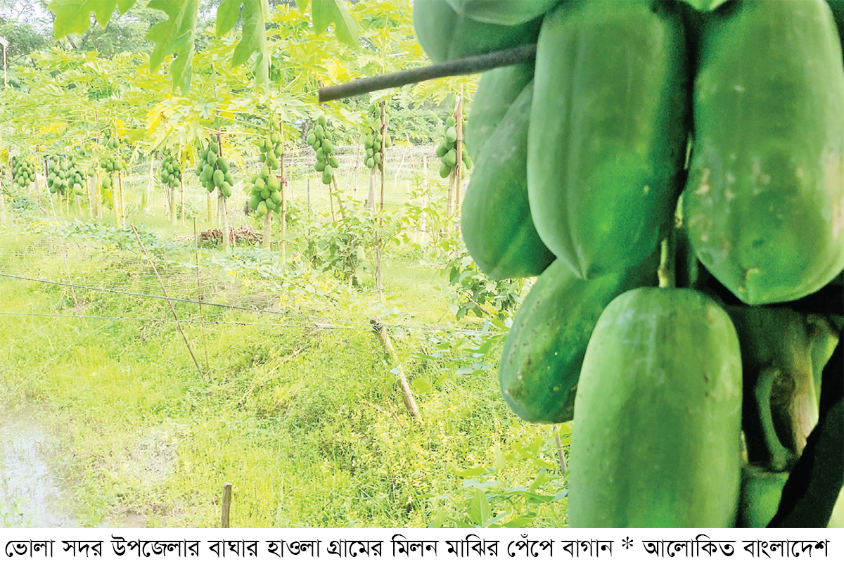 ভোলায় পেঁপে চাষ করে সাফল্য অর্জন করেছেন মিলন মাঝি নামের এক কৃষক। দীর্ঘদিন পতিত থাকা ১৮০ শতাংশ জমিতে পেঁপে চাষ করে এ সাফল্য অর্জন করেন। সদর উপজেলার পূর্ব ইলিশার বাঘার হাওলার কৃষক মিলন মাঝি বরিশাল থেকে সংগ্রহ করা ‘টপ লেডি’ জাতের ৩০০ পেঁপে চারা সার্জন পদ্ধতিতে ঘের তৈরি করে চারপাশে রোপণ করেন। বর্তমানে এর মধ্যে প্রায় ২৫০ থেকে ২৬৫টি গাছে থোকায় থোকায় ঝুলছে অসংখ্য পেঁপে। ‘টপ লেডি’ জাতের পেঁপে একটি হাইব্রিড জাত, যা ছোট গাছে বেশি ফলন দেয়, রোগ প্রতিরোধী এবং দীর্ঘ সময় ধরে ফলন দিতে সক্ষম। এর ফল পাকার পর লালচে হলুদ রঙের হয়, স্বাদে মিষ্টি ও সুস্বাদু। গাছ ছোট ও শক্তিশালী হওয়ায় ছাদ বাগানের জন্যও উপযোগী। রোপণের ৩-৪ মাস পরেই কাঁচা পেঁপে এবং ৬ মাস পরেই পাকা পেঁপে সংগ্রহ করা যায়।