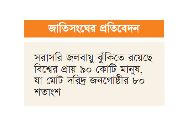 জলবায়ু পরিবর্তনের কারণে সৃষ্ট প্রাকৃতিক বিপর্যয়ের কারণে বিশ্বের ১০৯টি দেশের ৬৩০ কোটি মানুষের মধ্যে ১১০ কোটি মানুষ (প্রায় ১৮ শতাংশ) চরম বহুমাত্রিক দারিদ্র্যে ভুগছে। সরাসরি জলবায়ু ঝুঁকিতে রয়েছে বিশ্বের প্রায় ৯০ কোটি মানুষ যা মোট দরিদ্র জনগোষ্ঠীর ৮০ শতাংশ। গতকাল শুক্রবার অক্সফোর্ড বিশ্ববিদ্যালয়ের সঙ্গে যৌথভাবে জাতিসংঘের উন্নয়ন কর্মসূচি (ইউএনডিপি) প্রকাশিত প্রতিবেদনে এমন তথ্য উঠে এসেছে।