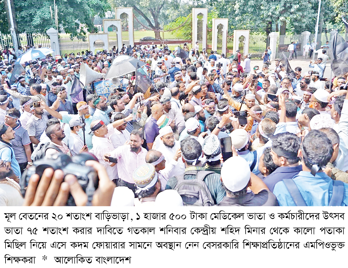 তিন দাবিতে কালো পতাকা মিছিল করেছেন বেসরকারি শিক্ষাপ্রতিষ্ঠানের শিক্ষক-কর্মচারীরা ২০ শতাংশ বাড়িভাড়া ভাতাসহ তিন দাবিতে আন্দোলনের সপ্তম দিনে কালো পতাকা মিছিল করেছেন বেসরকারি শিক্ষাপ্রতিষ্ঠানের এমপিওভুক্ত শিক্ষক-কর্মচারীরা। এ সময় তারা শিক্ষা উপদেষ্টার পদত্যাগের দাবিতে স্লোগান দেন। বিশেষ করে ‘সি আর আবরার, আর নেই দরকার’ স্লোগান শোনা যায় মিছিলে। গতকাল শনিবার দুপুর ১২টায় কেন্দ্রীয় শহিদ মিনার থেকে তারা মিছিল শুরু করেন। পরে মিছলটি দোয়েল চত্বর হয়ে কদম ফোয়ারায় গিয়ে এক সংক্ষিপ্ত সমাবেশে করে।