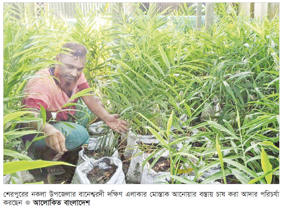 বহুবর্ষজীবী মিশ্র বাগানে নামমাত্র শ্রমে ও অল্প খরচে বস্তায় আদা চাষ করে বাড়তি আয়ের পথ খোঁজে পেয়েছেন শেরপুরের নকলা উপজেলার অনেকে। এমন একজন চাষি হলেন, উপজেলার বানেশ্বরদী ইউনিয়নের বানেশ্বরদী দক্ষিণ (কান্দাপাড়া) এলাকার মোস্তাক আনোয়ার রাকিব।
