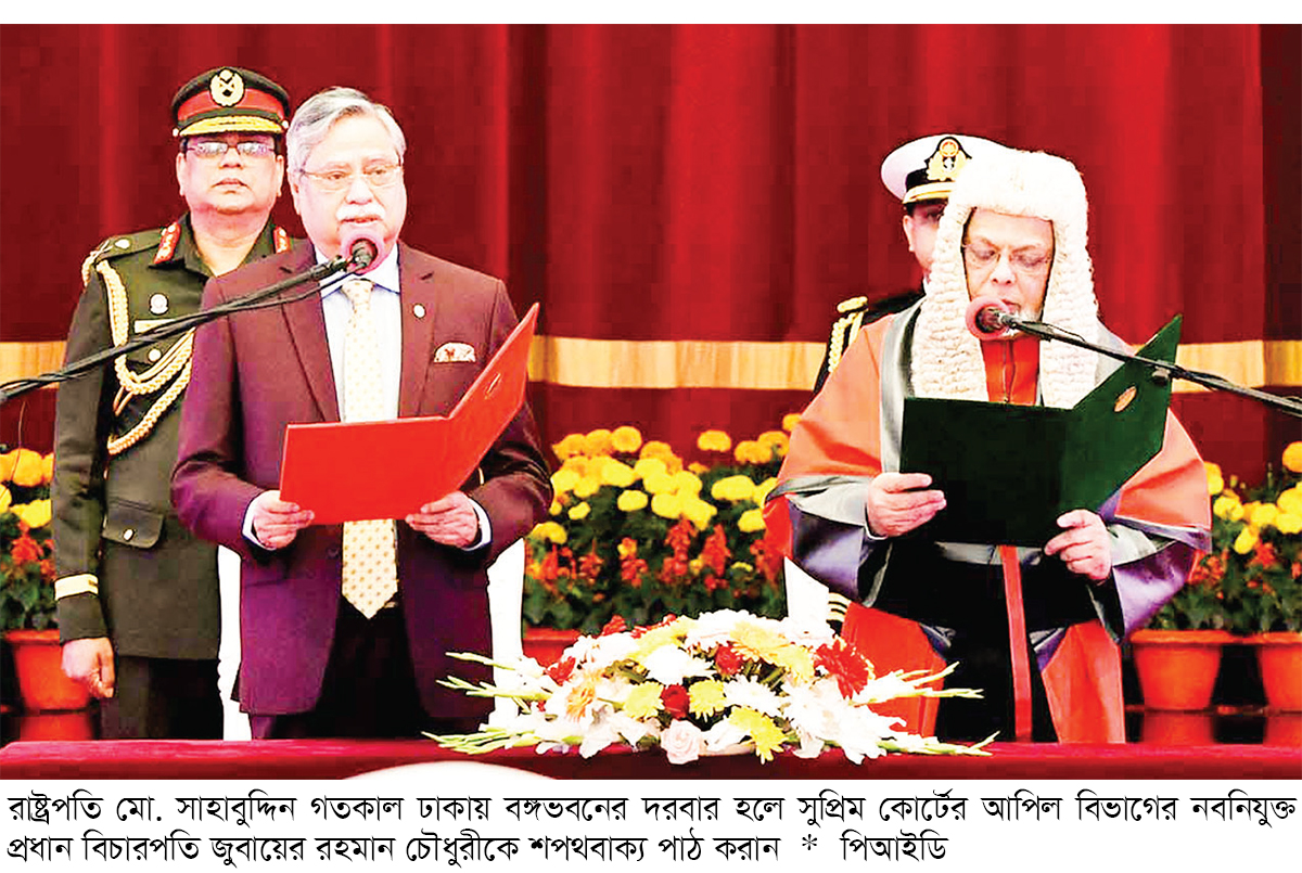 গতকাল রোববার সকালে বঙ্গভবনে তাকে শপথবাক্য পাঠ করান রাষ্ট্রপতি মো. সাহাবুদ্দিন। শপথ অনুষ্ঠানে অন্তর্বর্তী সরকারের প্রধান উপদেষ্টা ড. মুহাম্মদ ইউনূস, বিদায়ী প্রধান বিচারপতি সৈয়দ রেফাত আহমেদ, উপদেষ্টারা, প্রধান নির্বাচন কমিশনারসহ পদস্থ কর্মকর্তারা উপস্থিত ছিলেন। এর আগে গত ২৩ ডিসেম্বর আপিল বিভাগের বিচারপতি জুবায়ের রহমান চৌধুরীকে দেশের ২৬তম প্রধান বিচারপতি হিসেবে নিয়োগ দেন রাষ্ট্রপতি। বিচারপতি জুবায়ের রহমান চৌধুরী ঢাকা বিশ্ববিদ্যালয় থেকে এলএলবি ও এলএলএম ডিগ্রি অর্জন করেন। পরে যুক্তরাজ্য থেকেও আন্তর্জাতিক আইনে এলএলএম ডিগ্রি নেন। ১৯৮৫ সালে তিনি জেলা আদালতে ও ১৯৮৭ সালে সুপ্রিম কোর্টের হাইকোর্ট বিভাগে আইনজীবী হিসেবে অন্তর্ভুক্ত হন। ২০০৩ সালের ২৭ আগস্ট হাইকোর্ট বিভাগের অতিরিক্ত বিচারপতি ও দুই বছর পরে স্থায়ী বিচারপতি হিসেবে নিয়োগ পান।