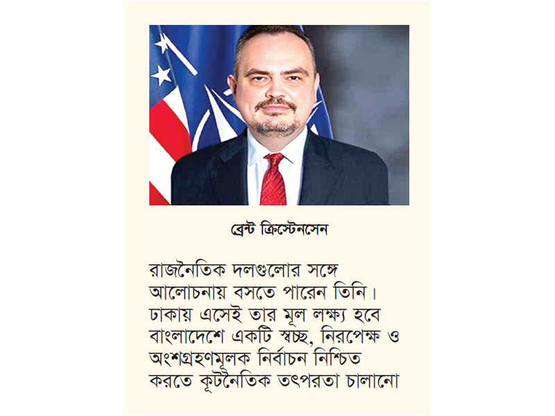 জাতীয় নির্বাচনের আগেই ঢাকায় আসছেন যুক্তরাষ্ট্রের নবনিযুক্ত রাষ্ট্রদূত ব্রেন্ট ক্রিস্টেনসেন। আগামী ১২ জানুয়ারি ঢাকায় আসবেন তিনি। পরে বাংলাদেশের রাষ্ট্রপতির কাছে পরিচয়পত্র পেশ করে দ্রুততম সময়ের মধ্যে তিনি বাংলাদেশে নতুন মিশন শুরু করবেন। জানা গেছে, আসন্ন নির্বাচনকে ঘিরে সব পক্ষের রাজনৈতিক দলগুলোর সঙ্গে আলোচনায় বসতে পারেন। ঢাকায় এসেই তার মূল লক্ষ্য হবে বাংলাদেশে একটি স্বচ্ছ, নিরপেক্ষ ও অংশগ্রহণমূলক নির্বাচন নিশ্চিত করতে কূটনৈতিক তৎপরতা চালানো। এ ছাড়া মানবাধিকার রক্ষা, রোহিঙ্গা সংকট সমাধান এবং দ্বিপক্ষীয় বাণিজ্য সম্পর্ক জোরদার করার বিষয়েও কাজ করবেন তিনি। ব্রেন্ট ক্রিস্টেনসেন ঢাকায় যোগদান উপলক্ষে ঢাকার মার্কিন দূতাবাসের তিন সদস্যের একটি প্রতিনিধিদল গতকাল মঙ্গলবার পররাষ্ট্র মন্ত্রণালয়ে পররাষ্ট্রসচিব আসাদ আলম সিয়ামের সঙ্গে বৈঠক করেছেন। এ সময় রাষ্ট্রদূতের ঢাকায় আসার বিষয়ে বিস্তারিত আলোচনা হয়েছে বলে জানা গেছে। ব্রেন্ট ক্রিস্টেনসেন মার্কিন ফরেন সার্ভিসের একজন সিনিয়র কর্মকর্তা। ২০১৯-২০২১ সাল পর্যন্ত তিনি ঢাকার মার্কিন দূতাবাসে রাজনৈতিক ও অর্থনৈতিক কাউন্সেলর হিসেবে দায়িত্ব পালন করেছেন। ফলে বাংলাদেশের রাজনৈতিক দলগুলোর শীর্ষ নেতাদের সঙ্গে তার পূর্বপরিচয় ও অভিজ্ঞতা মাঠ পর্যায়ে কাজ করতে তাকে বাড়তি সুবিধা দেবে।
