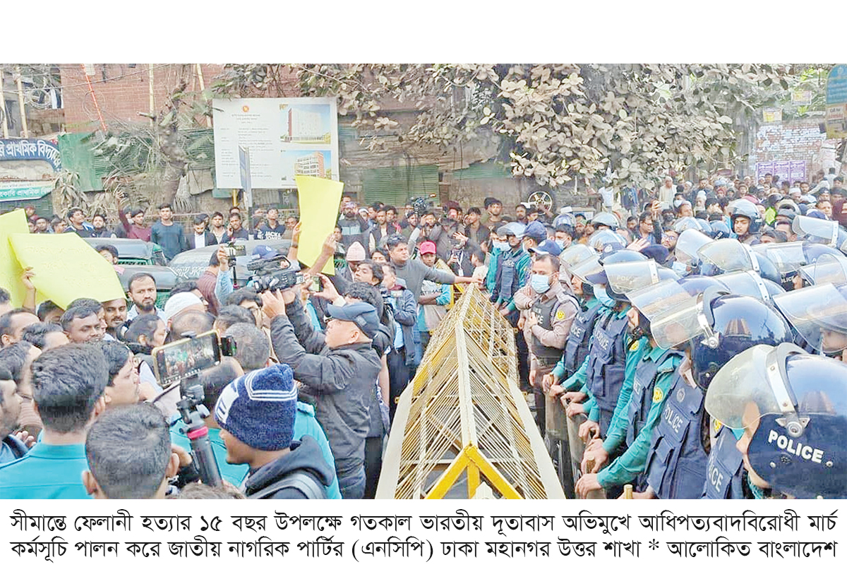 গতকাল বুধবার রাজধানীর জাতীয় প্রেসক্লাবের সামনে আয়োজিত এক প্রতিবাদী সমাবেশে ভুক্তভোগী পরিবারের সদস্যরা এ কথা বলেন। ‘বাংলাদেশ-ভারত রক্তাক্ত সীমান্ত’ শীর্ষক এই সমাবেশের আয়োজক মানবাধিকার সংস্থা অধিকার। সমাবেশ সঞ্চালনা করেন অধিকারের পরিচালক এএসএম নাসির উদ্দিন। সমাবেশে ফেলানীসহ বাংলাদেশি নাগরিকদের ভারতীয় সীমান্তরক্ষী বাহিনী বিএসএফ কর্তৃক হত্যা, নির্যাতন, গুম, পুশইনের বিচারের দাবি করা হয়। মানবাধিকার লঙ্ঘন বন্ধের দাবি জানানো হয়। একই সঙ্গে বাংলাদেশে ভারতের আধিপত্যবাদ রুখে দেওয়ার আহ্বান জানানো হয়। ২০১১ সালের ৭ জানুয়ারি কুড়িগ্রামের ফুলবাড়ী উপজেলার অনন্তপুর সীমান্তে বিএসএফের গুলিতে নিহত হয় ১৪ বছর বয়সী বাংলাদেশি কিশোরী ফেলানী। তার লাশ অন্তত পাঁচ ঘণ্টা কাঁটাতারে ঝুলে ছিল। সেই ছবি দেশি-বিদেশি সংবাদমাধ্যমে প্রকাশিত হলে সমালোচনার ঝড় ওঠে। সমাবেশে অধিকারের পরিচালক তাসকিন ফাহমিদা বলেন- ভারত শুধু সীমান্তে বাংলাদেশিদের হত্যাই করছে না, তারা বাংলাদেশের খুনি-অপরাধীদেরও আশ্রয় দিচ্ছে। সীমান্তে বাংলাদেশের নাগরিক হত্যা বন্ধ করতে হবে। এসব হত্যার সঙ্গে জড়িতদের বিচার করতে হবে।