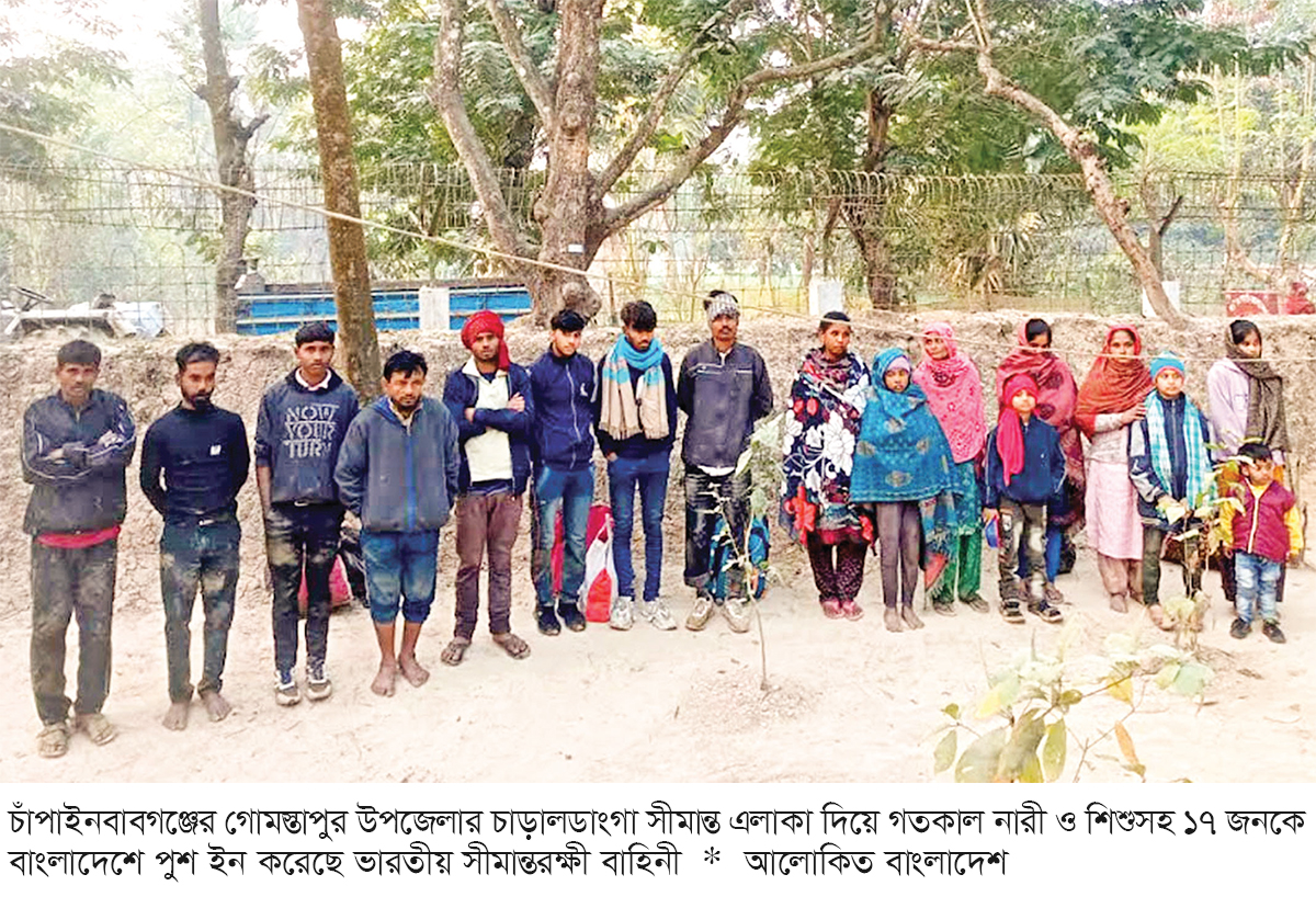 চাঁপাইনবাবগঞ্জের গোমস্তাপুর সীমান্ত দিয়ে নারী, শিশুসহ ১৭ জনকে বাংলাদেশে ঠেলে পাঠিয়েছে ভারতীয় সীমান্তরক্ষী বাহিনী (বিএসএফ)। গত মঙ্গলবার রাতের আঁধারে উপজেলার চাঁড়ালডাঙ্গা সীমান্ত দিয়ে তাঁদের দেশে পাঠানো হয়। পরে গতকাল বুধবার সকালে তাঁদের আটক করে বিজিবি।