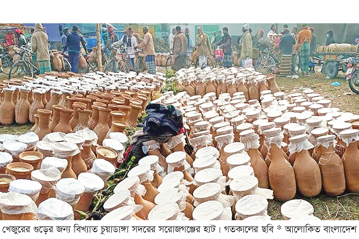 চুয়াডাঙ্গার সদর উপজেলার সরোজগঞ্জ বাজারে জমে উঠেছে দেশের সর্ববৃহৎ ঐতিহ্যবাহী খেজুর গুড়ের হাট। সরোজগঞ্জ বাজার থেকে একটু ভেতরে প্রবেশ করলে চোখে পড়বে বিস্তীর্ণ এলাকাজুড়ে সারি সারি সাজানো গুড়ের ভাঁড়। প্রায় ২০০ বছর ধরে ঐতিহ্যবাহী খেজুর গুড়ের এ হাটের নামডাক দেশজুড়ে। সেই সঙ্গে ক্রেতা-বিক্রেতা ও শ্রমিকদের কর্মযজ্ঞ। প্রতি বছরের মতো এবারও দেশের বৃহৎ ঐতিহ্যবাহী খেজুর গুড়ের হাট জমে উঠেছে সরোজগঞ্জে। গুড় কিনতে বিভিন্ন জেলা থেকে আসছেন বেপারিরা। সপ্তাহে শুক্র ও সোমবার বসে এ হাট। খেজুরগাছ থেকে সংগ্রহ করা রস দিয়ে তৈরি ঝোলাগুড় ও নলেন পাটালি বেচাকেনার জন্য এই হাটের ঐতিহ্য প্রায় ২০০ বছরের। চুয়াডাঙ্গা জেলার সদর উপজেলার কুতুবপুর ইউনিয়নের সরোজগঞ্জে চুয়াডাঙ্গা-ঝিনাইদহ আঞ্চলিক মহাসড়ক ঘেঁষে স্থানীয় সরোজগঞ্জ উচ্চ বিদ্যালয়ের মাঠে এই হাটের অবস্থান। সকাল থেকে সন্ধ্যা পর্যন্ত চলে বেচাকেনা। প্রতি সপ্তাহে কয়েক কোটি টাকার গুড় কেনাবেচা হয়। মাটির হাঁড়ি বা ভাঁড়ের আকার ও ওজনভেদে দাম ওঠানামা করে। মানভেদে এক ভাঁড় গুড় বিক্রি হচ্ছে ১ হাজার ৮০০ থেকে ২ হাজার ২০০ টাকায়। স্বাদে ও গন্ধে এখানকার গুড় অতুলনীয়। এখানকার খেজুর গুড়ের চাহিদা বেশি থাকায় দামও বাড়ছে। গতকাল শুক্রবার সকালে সরোজগঞ্জ বাজারে গুড়ের হাট সরেজমিনে দেখা যায়, পুরো এলাকায় সাজানো খেজুর গুড়ভর্তি মাটির ভাঁড় এবং ছোট ছোট ধামা-কাঠায় নলেন পাটালি। ক্রেতা-দর্শনার্থীরা ঘুরে ঘুরে দেখছেন। দরদাম করছেন ক্রেতারা। দামে বনিবনা হলে ওজন করে ভর্তি করা হচ্ছে ট্রাক। আবার কেউ কেউ নিজের বাড়ি বা আত্মীয়ের বাড়ি পাঠানোর জন্য চাহিদা অনুযায়ী কিনছেন গুড় কিংবা পাটালি।