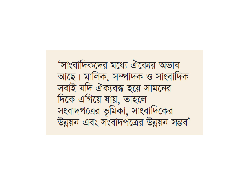 গাজীপুরের শ্রীপুর প্রেসক্লাবের সভাপতি এসএম মাহফুল হাসান হান্নান বলেন, ‘সত্যিই ঐক্যের কোনো বিকল্প নেই। অধিকার কেউ কাউকে বিলিয়ে দেয় না, আদায় করে নিতে হয়। আমাদের অধিকার আমাদেরই আদায় করে নিতে হবে। আমি আজকে অনুরোধ করব সম্পাদক পরিষদকে একটা আইন করার জন্য, এটা যদি আমাদের আইন আমরা নিজেরা করে নেই, তাহলে আসলে দুর্বৃত্ত সাংবাদিক থাকবে না এবং আমাদের ঐক্যও ঠিক থাকবে।’