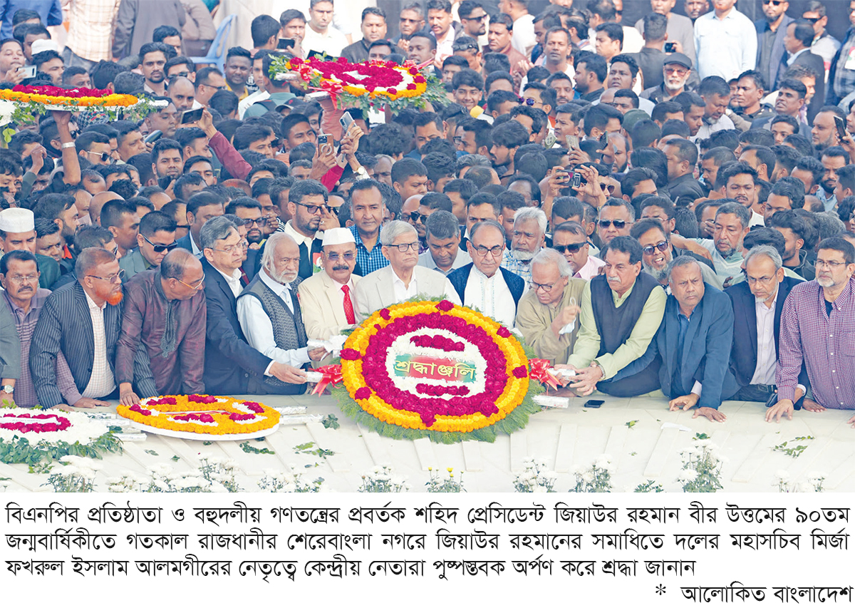জিয়ার সমাধিতে বিএনপির শ্রদ্ধা : বাংলাদেশ জাতীয়তাবাদী দল বিএনপির উদ্যোগে শহিদ প্রেসিডেন্ট জিয়াউর রহমানের ৯০তম জন্মদিন উপলক্ষে তার সমাধিতে শ্রদ্ধা নিবেদন ও ফাতেহা পাঠ করা হয়েছে। গতকাল সোমবার দুপুরে রাজধানীর শেরেবাংলা নগর থানার জিয়া উদ্যানে এ কর্মসূচি অনুষ্ঠিত হয়। কর্মসূচিতে বিএনপির পক্ষ থেকে ফুল দিয়ে প্রয়াত রাষ্ট্রপতি জিয়াউর রহমানের সমাধিতে শ্রদ্ধা জানানো হয়। পরে তার রুহের মাগফিরাত কামনা করে ফাতেহা পাঠ ও দোয়া করা হয়। এতে বিএনপির বিভিন্ন পর্যায়ের প্রায় চার থেকে সাড়ে চার হাজার নেতাকর্মী অংশ নেন।