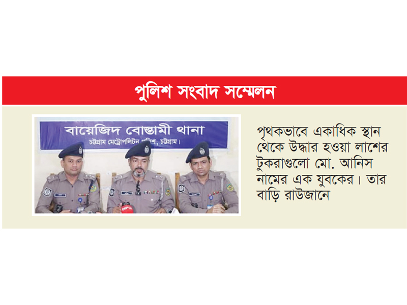 চট্টগ্রামের বায়েজিদে পৃথকভাবে একাধিক স্থান থেকে উদ্ধার হওয়া লাশের টুকরাগুলো মো. আনিস নামের এক যুবকের। তাঁর বাড়ি জেলার রাউজানে। পুলিশ জানিয়েছে, এক নারী বাসায় ডেকে নিয়ে প্রথমে আনিসের মাথায় মসলা বাটার নোড়া (শিল) দিয়ে আঘাত করেন। এরপর আরও দুজনের সহায়তায় আনিসের শরীর চাপাতি দিয়ে কেটে ছয় টুকরা করেন। পরে এসব টুকরা ফেলা হয় আশপাশের এলাকার খাল ও ভাগাড়ে।