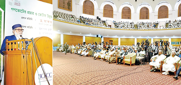 ধর্ম উপদেষ্টা ড. আ ফ ম খালিদ হোসেন গতকাল রোববার দুপুরে রাজধানীর আগারগাঁওয়ে বাংলাদেশ চীন মৈত্রী সম্মেলন কেন্দ্রে গণভোটের প্রচার ও ভোটার উদ্বুদ্ধকরণের উদ্দেশে আয়োজিত জাতীয় ইমাম সম্মেলনে প্রধান অতিথির বক্তব্য রাখেন * আলোকিত বাংলাদেশ