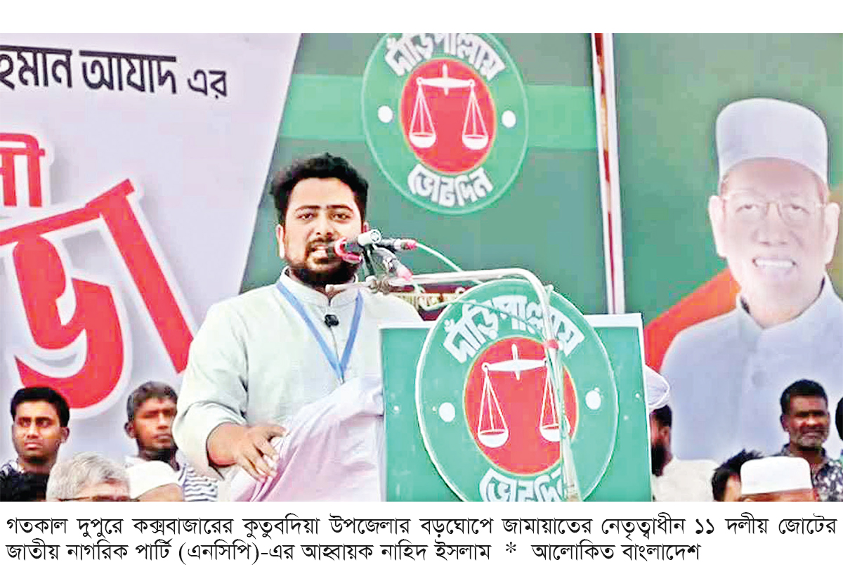 ৫ আগস্টের পর নতুন করে চাঁদাবাজি, জমি দখল ও ফ্যাসিস্টদের পুনর্বাসনের নীতি যারা নিয়েছে, তারাই বাংলাদেশের ‘নতুন জালেম’ হিসেবে আত্মপ্রকাশ করেছে বলে মন্তব্য করেছেন জাতীয় নাগরিক পার্টির আহ্বায়ক নাহিদ ইসলাম। তিনি বলেন, এই জালেমদের রুখে দেওয়ার দিনই হচ্ছে আগামী ১২ ফেব্রুয়ারি। গতকাল বৃহস্পতিবার কক্সবাজারের কুতুবদিয়ার বড়ঘোপে জামায়াতের নেতৃত্বাধীন ১১ দলীয় জোটের প্রার্থী এএইচ এম হামিদুর রহমান আজাদের সমর্থনে আয়োজিত নির্বাচনী জনসভায় তিনি এসব কথা বলেন। নাহিদ ইসলাম বলেন, বাংলাদেশের সরকার কে গঠন করবে, তা নির্ধারণ করবে এ দেশের জনগণ। দিল্লি থেকে কোনো ষড়যন্ত্র এ দেশের মানুষ মেনে নেবে না। বাংলাদেশে আর কখনো দিল্লির দাদাগিরি চলবে না।