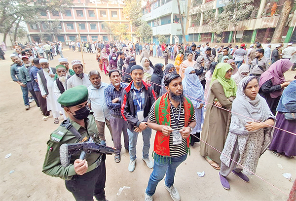 গতকাল বৃহস্পতিবার উৎসবমুখর পরিবেশে অনুষ্ঠিত হয়েছে ত্রয়োদশ জাতীয় সংসদ নির্বাচন ও গণভোট। ছবিটি রাজধানীর সেগুনবাগিচা উচ্চ বিদ্যালয় কেন্দ্র থেকে তোলা * আলোকিত বাংলাদেশ