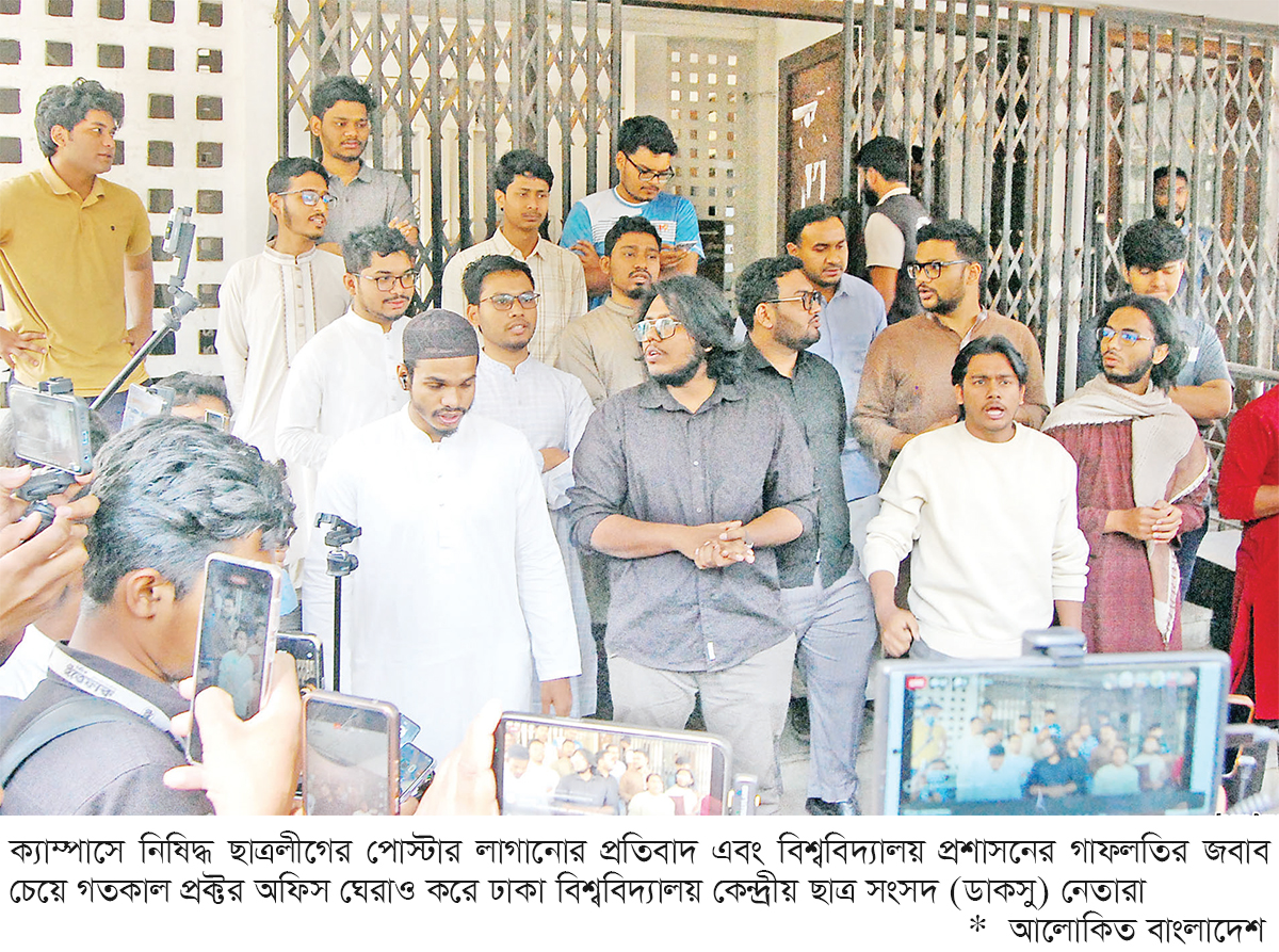 ঢাকা বিশ্ববিদ্যালয়ের (ঢাবি) কয়েকটি স্থানে পোস্টার সাঁটিয়েছে নিষিদ্ধ ঘোষিত সংগঠন ছাত্রলীগ। গত শুক্রবার রাতে বিশ্ববিদ্যালয়ের বিভিন্ন দেয়ালে ‘বাংলাদেশ ছাত্রলীগের সব রাজবন্দির নিঃশর্ত মুক্তি চাই’ লেখা সংবলিত পোস্টার দেখা যায়। এ ঘটনার প্রতিবাদ জানিয়ে গতকাল শনিবার দুপুরে প্রক্টর অফিস ঘেরাও কর্মসূচি পালন করেছে ঢাকা বিশ্ববিদ্যালয় কেন্দ্রীয় ছাত্রসংসদ (ডাকসু)। কর্মমূচি থেকে ডাকসু নেতারা ২৪ ঘণ্টার মধ্যে সিসিটিভি ফুটেজ যাচাই করে দায়ীদের শনাক্ত করে আইনের আওতায় আনার দাবি জানিয়েছেন। এদিন দুপুর ১টার দিকে ডাকসু নেতারা প্রক্টর অফিসের সামনে অবস্থান নিয়ে বিভিন্ন স্লোগান দেন ডাকসু নেতারা।