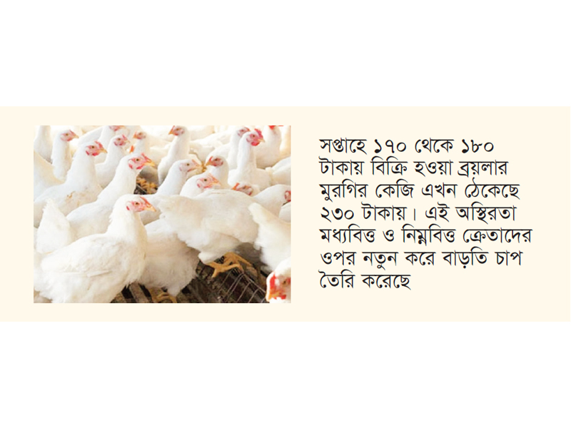 মাত্র এক সপ্তাহের ব্যবধানে রাজধানীর বাজারে অস্বাভাবিক হারে বেড়েছে ব্রয়লার মুরগির দাম। গত সপ্তাহে ১৭০ থেকে ১৮০ টাকায় বিক্রি হওয়া ব্রয়লার মুরগির কেজি এখন ঠেকেছে ২৩০ টাকায়। অর্থাৎ সাত দিনের ব্যবধানে কেজিতে দাম বেড়েছে প্রায় ৫০ থেকে ৬০ টাকা। মুরগির বাজারের এই অস্থিরতা মধ্যবিত্ত ও নিম্নবিত্ত ক্রেতাদের ওপর নতুন করে বাড়তি চাপ তৈরি করেছে। গতকাল শুক্রবার রাজধানীর নিউমার্কেটের কাঁচাবাজারসহ আশপাশের খুচরা বাজারগুলোতে এমন চিত্র দেখা গেছে। বাজারে ঘুরে দেখা যায়, ব্রয়লারের পাশাপাশি অন্যান্য জাতের মুরগির দামও চড়া। কক মুরগি কেজিপ্রতি প্রায় ৩৫০ টাকা, লেয়ার ৩৬০ টাকা এবং দেশি মুরগি ৭৩০ টাকায় বিক্রি হচ্ছে।