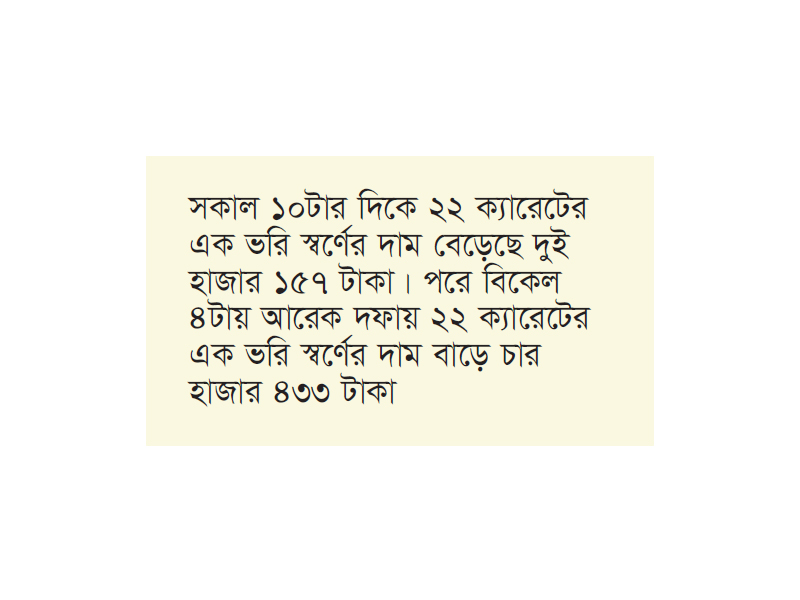 নতুন দাম অনুযায়ী, শনিবার বিকেল থেকে ২২ ক্যারেটের এক ভরি স্বর্ণ দুই লাখ ৪১ হাজার ৪৪৫ টাকা, ২১ ক্যারেটের প্রতি ভরি দুই লাখ ৩০ হাজার ৪২২ টাকা, ১৮ ক্যারেটের প্রতি ভরি এক লাখ ৯৭ হাজার ৫৩০ টাকা ও সনাতন পদ্ধতির প্রতি ভরি স্বর্ণ এক লাখ ৬০ হাজার ৮৪৭ টাকায় বিক্রি হবে। এর আগে শনিবার ১০টা থেকে ২২ ক্যারেটের এক ভরি স্বর্ণ দুই লাখ ৩৭ হাজার ১২ টাকা, ২১ ক্যারেটের প্রতি ভরি দুই লাখ ২৬ হাজার ২৮২ টাকা, ১৮ ক্যারেটের প্রতি ভরি এক লাখ ৯৩ হাজার ৯১৪ টাকা ও সনাতন পদ্ধতির প্রতি ভরি স্বর্ণ এক লাখ ৫৭ হাজার ৯৩১ টাকায় বিক্রি হয়েছে।