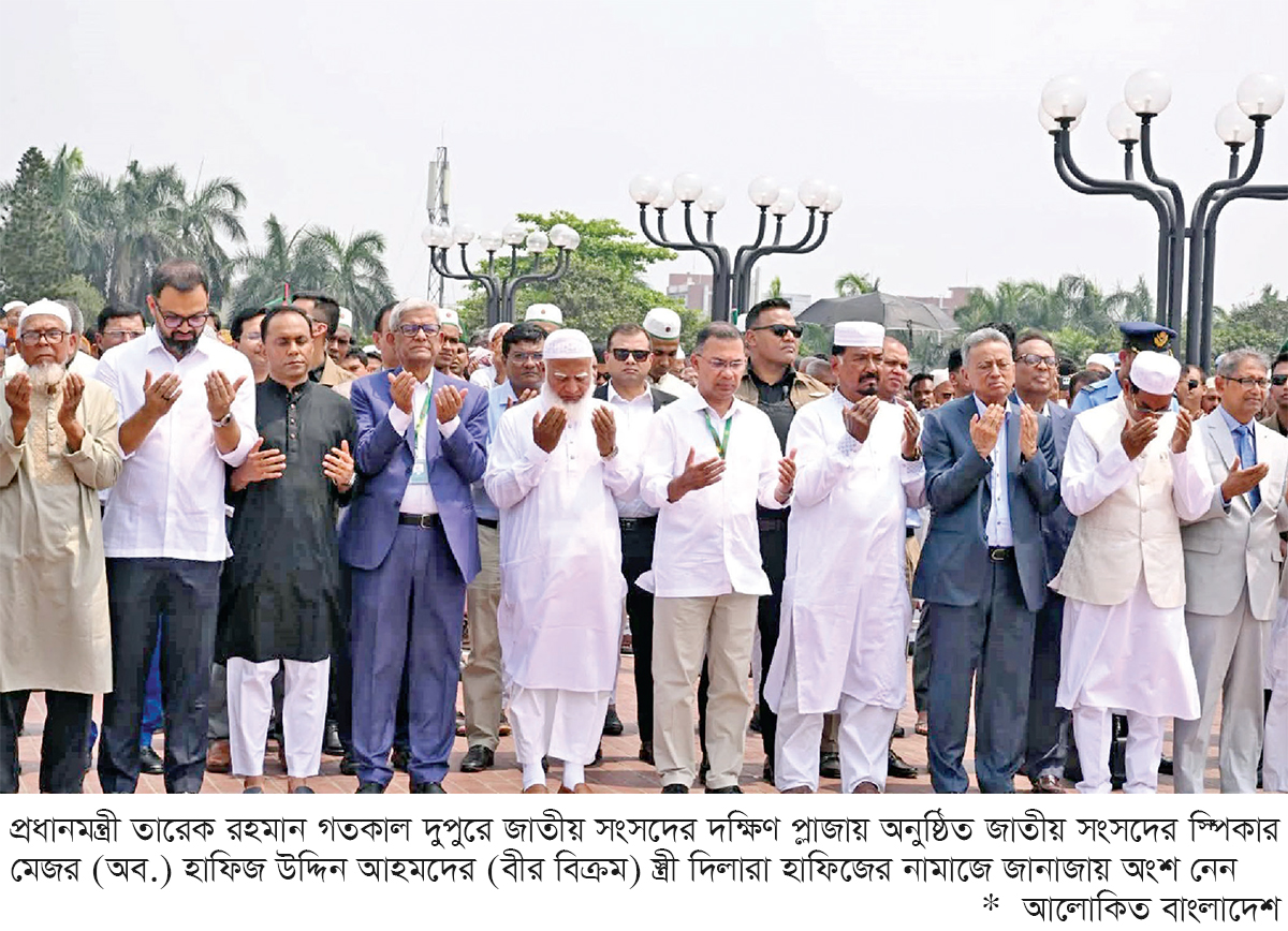 জাতীয় সংসদের স্পিকার মেজর (অব.) হাফিজ উদ্দিন আহমদের স্ত্রী দিলারা হাফিজের জানাজা জাতীয় সংসদ ভবনের দক্ষিণ প্লাজায় সম্পন্ন হয়েছে। গতকাল সোমবার দুপুর সাড়ে ১২টায় অনুষ্ঠিত জানাজায় অংশ নেন প্রধানমন্ত্রী তারেক রহমান, বিরোধী দলীয় নেতা ডা. শফিকুর রহমান, স্পিকার, ডেপুটি স্পিকার, মন্ত্রিসভার সদস্য ও সংসদ সদস্যরা। জানাজার আগে মরদেহে শ্রদ্ধা নিবেদন করেন প্রধানমন্ত্রী। এর আগে সকাল সাড়ে ৯টায় সিএমএইচ থেকে তার মরদেহ বনানীর বাসভবনে নেওয়া হয়। সেখানে তার কোরআন তেলাওয়াত ও দোয়া করেন স্বজনরা।