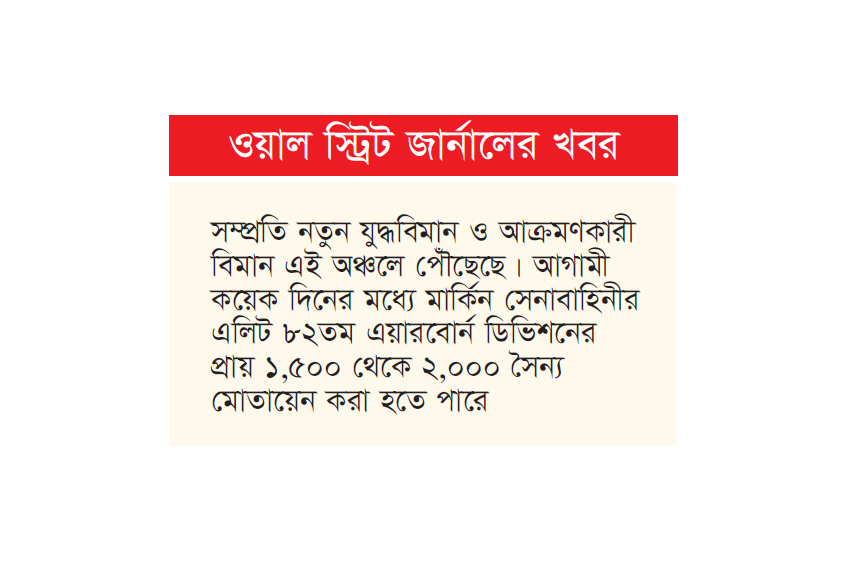 দুই সপ্তাহের যুদ্ধবিরতির মধ্যেই যুক্তরাষ্ট্র সম্ভাব্য সামরিক অভিযানের জন্য মধ্যপ্রাচ্যে সেনা মোতায়েন অব্যাহত রেখেছে। পাকিস্তানে ইরানের সঙ্গে আলোচনার প্রস্তুতি চলার মধ্যেও সামরিক উপস্থিতি বাড়ানো হচ্ছে বলে মার্কিন কর্মকর্তাদের উদ্ধৃতি দিয়ে সংবাদ প্রকাশ করেছে দ্য ওয়াল স্ট্রিট জার্নাল।