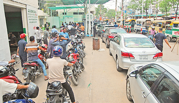 সারাদেশে বিভিন্ন এলাকায় জ্বালানি তেল কিনতে পেট্রল পাম্পগুলোতে যানবাহন চালকদের দীর্ঘ লাইন দেখা গেছে। রাজধানীর নীলক্ষেতের কিউজে সামদানি পেট্রল পাম্প থেকে তেল কিনতে আসা ক্রেতাদের লাইন নীলক্ষেত মোড় থেকে ইডেন কলেজ পর্যন্ত ছাড়িয়ে যায়। ছবিটি গতকাল তোলা * আলোকিত বাংলাদেশ