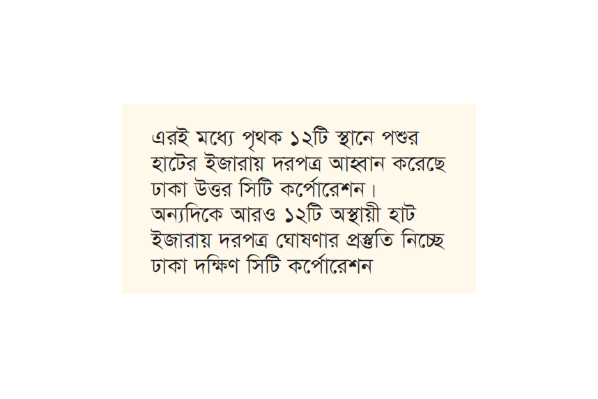 এদিকে সীমানা জটিলতা ও আবাসিক এলাকার পরিবেশ এবং জনদুর্ভোগ আশঙ্কায় আফতাবনগরে হাট বসবে কি না, তা নিয়ে হিসাব কষছে ডিএসসিসি। কারণ, গত বছর স্থানীয়দের বাধা ও উচ্চ আদালতের নিষেধাজ্ঞার কারণে আফতাবনগরে পশুর হাট বসানোর ইজারা কার্যক্রম স্থগিত করা হয়। ডিএনসিসি এলাকার পশুর হাট : গত ৯ এপ্রিল ১২টি হাটের নাম উল্লেখ করে দরপত্র আহ্বান করে ঢাকা উত্তর সিটি করপোরেশন (ডিএনসিসি)। হাটগুলো হলো- খিলক্ষেত বাজার সংলগ্ন এলিভেটেড এক্সপ্রেসওয়ের নিচের খালি জায়গা (সরকারি মূল্য এক কোটি ৫১ লাখ টাকা), মিরপুর সেকশন-৬ এর ইস্টার্ণ হাউজিংয়ের খালি জায়গা (এক কোটি ৭৬ লাখ ৪৭ হাজার ৮৫৮ টাকা), মিরপুর কালশী বালুর মাঠের (১৬ বিঘা) খালি জায়গা (৩০ লাখ টাকা), ঢাকা পলিটেকনিক ইনস্টিটিউ সংলগ্ন খালি জায়গা (এক কোটি ১৩ লাখ ৫ হাজার ৯০০ টাকা), মেরুল বাড্ডা কাঁচাবাজার সংলগ্ন খালি জায়গা (১৪ লাখ টাকা), ২৩ নম্বর ওয়ার্ডের পূর্ব হাজীপাড়ার ইকরা মাদরাসার পাশের খালি জায়গা (১৩ লাখ ৫০ হাজার টাকা)। মোহাম্মদপুরের বছিলার ৪০ ফুট রাস্তা সংলগ্ন খালি জায়গা (এক কোটি ৯৬ লাখ ২০ হাজার ৪৫৬ টাকা), উত্তরা দিয়াবাড়ির ১৬ ও ১৮ নম্বর সেক্টর সংলগ্ন বউ বাজার এলাকার খালি জায়গা (আট কোটি ৩০ লাখ ৩৩ হাজার ৩৩৪ টাকা), ভাটুলিয়া সাহেব আলী মাদরাসা থেকে ১০ নম্বর সেক্টর রানাভোলা অ্যাভিনিউ সংলগ্ন উত্তরা রানাভোলা স্লুইসগেট পর্যন্ত খালি জায়গা (৮৮ লাখ ২০ হাজার ৭৫০ টাকা), ৪৪ নম্বর ওয়ার্ডের কাঁচকুড়া বাজার সংলগ্ন রহমাননগর আবাসিক এলাকার খালি জায়গা (১৫ লাখ ৫ হাজার ৫০০ টাকা), খিলক্ষেতের মস্তুল চেকপোস্ট সংলগ্ন পশ্চিম পাড়ার খালি জায়গা (৯৩ লাখ ২২ হাজার ৩৩৪ টাকা) ও ভাটারা সুতিতোলা খাল সংলগ্ন খালি জায়গা (তিন কোটি ১২ লাখ ৭৬ হাজার ৬৬৭ টাকা)।