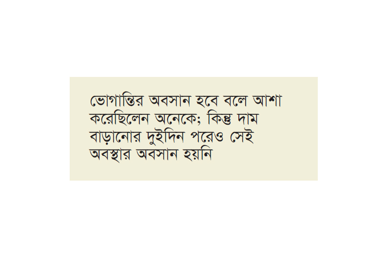 জ্বালানি তেলের দাম বাড়লে ফিলিং স্টেশন থেকে তেল পেতে দেড় মাসের বেশি সময় ধরে চলা ভোগান্তির অবসান হবে বলে আশা করেছিলেন অনেকে; কিন্তু দাম বাড়ানোর দুই দিন পরেও সেই অবস্থার অবসান হয়নি। এখনো জ্বালানি তেলের জন্য ঘণ্টার পর ঘণ্টা অপেক্ষা করতে হচ্ছে। গতকাল মঙ্গলবার দুপুর ১২টায় রাজধানীর শহীদবাগে অবস্থিত রাজারবাগ ফিলিং স্টেশন ঘুরে দেখা যায়, জ্বালানি তেলের জন্য আগের চেয়ে লম্বা লাইন। দুই সপ্তাহ ঘুরে দেখা গেছে এই ফিলিং স্টেশনে মোটরসাইকেলের লাইন ফিলিং স্টেশনটির সামনে থেকে শহীদবাগের বিএনএন হাসপাতালের সামনে ঘুরে শান্তিনগরের সড়কের মাথা পর্যন্ত পৌঁছেছিল; কিন্তু আজকে সেই লাইন শান্তিনগর সড়কের মাঝামাঝি পর্যন্ত পৌঁছে গেছে। এই ফিলিং স্টেশন থেকে তেল নেওয়ার জন্য সকাল আটটার সময় লাইনে দাঁড়ান মোটরসাইকেলচালক নাজিম উদ্দিন। বেলা ১১টা পর্যন্ত তেল পাননি তিনি। তখনো তার সামনে শতাধিক মোটরসাইকেল তেলের জন্য অপেক্ষায় ছিল। নাজিম উদ্দিন জানান, মোটরসাইকেলে রাইড শেয়ার (ভাড়ায় যাত্রী পরিবহন) করেন। ভেবেছিলেন তেলের দাম বাড়লে হয়তো লাইন কমবে; কিন্তু ফিলিং স্টেশন এসে দেখেন, লাইন কমেনি, উল্টো আরও বেড়েছে।