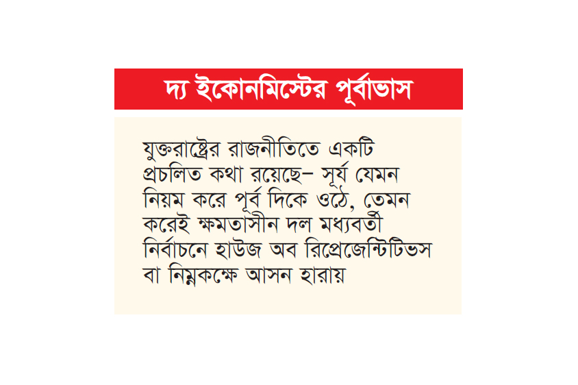 সিনেটেও অনিশ্চয়তার মুখে রিপাবলিকানরা : সবচেয়ে অবাক করা বিষয় হলো উচ্চকক্ষ বা সিনেটের পূর্বাভাস। কাগজে-কলমে সিনেটের বর্তমান চিত্র রিপাবলিকানদের জন্য অত্যন্ত শক্তিশালী মনে হলেও ইকোনমিস্টের মডেল বলছে, ডেমোক্র্যাটদের সিনেট দখলের সম্ভাবনা ৪৬ শতাংশ। সাধারণত মধ্যবর্তী নির্বাচনে বিরোধী দল এমনিতেই সুবিধা পায়। তার ওপর, ট্রাম্পের জনপ্রিয়তার হার ১৭ পয়েন্ট নেতিবাচক থাকায় সেই সম্ভাবনা আরও জোরালো হচ্ছে। বিশেষ করে, যারা এখনও কোনো পক্ষ নির্ধারণ করতে পারেননি, তারা শেষ মুহূর্তে ক্ষমতাসীনদের বিপক্ষেই ভোট দেন বলে তথ্যে উঠে এসেছে।