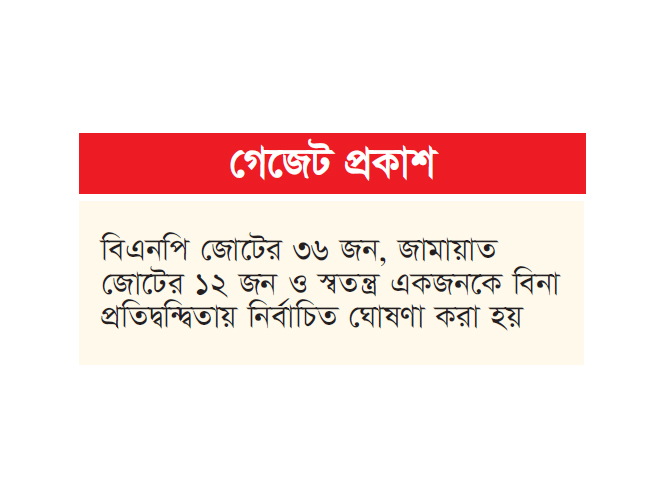 ত্রয়োদশ সংসদের ৫০টি সংরক্ষিত নারী আসনের মধ্যে বিনাপ্রতিদ্বন্দ্বিতায় নির্বাচিত ৪৯ জনের নাম, ঠিকানাসহ গেজেট প্রকাশ করেছে নির্বাচন কমিশন (ইসি)। গতকাল বৃহস্পতিবার ইসি সচিবের রুটিন দায়িত্বে থাকা কেএম আলী নেওয়াজ স্বাক্ষরিত এ গেজেট প্রকাশ করা হয়। বাকি একটি আসন নিয়ে এখনো জটিলতা আছে। এই একটি আসনের বিষয়টি ইসির নিষ্পত্তির অপেক্ষায় রয়েছে।